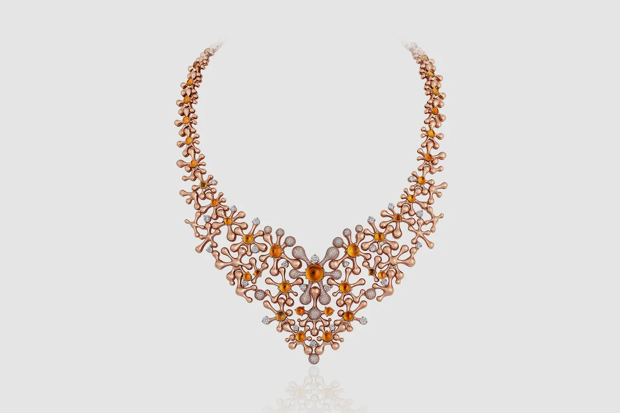 Колье «Атом», выполненное из красного золота и дополненное бриллиантами и желтыми сапфирами, не просто произведение искусства и украшение. Автор усовершенствовала процесс разработки, создав цифровую модель и сделав все просчеты через 3D-модель. Такой формат создания позволил произвести в единственном экземпляре продукт, который при традиционном подходе мог бы родиться только в рамках серийного производства.