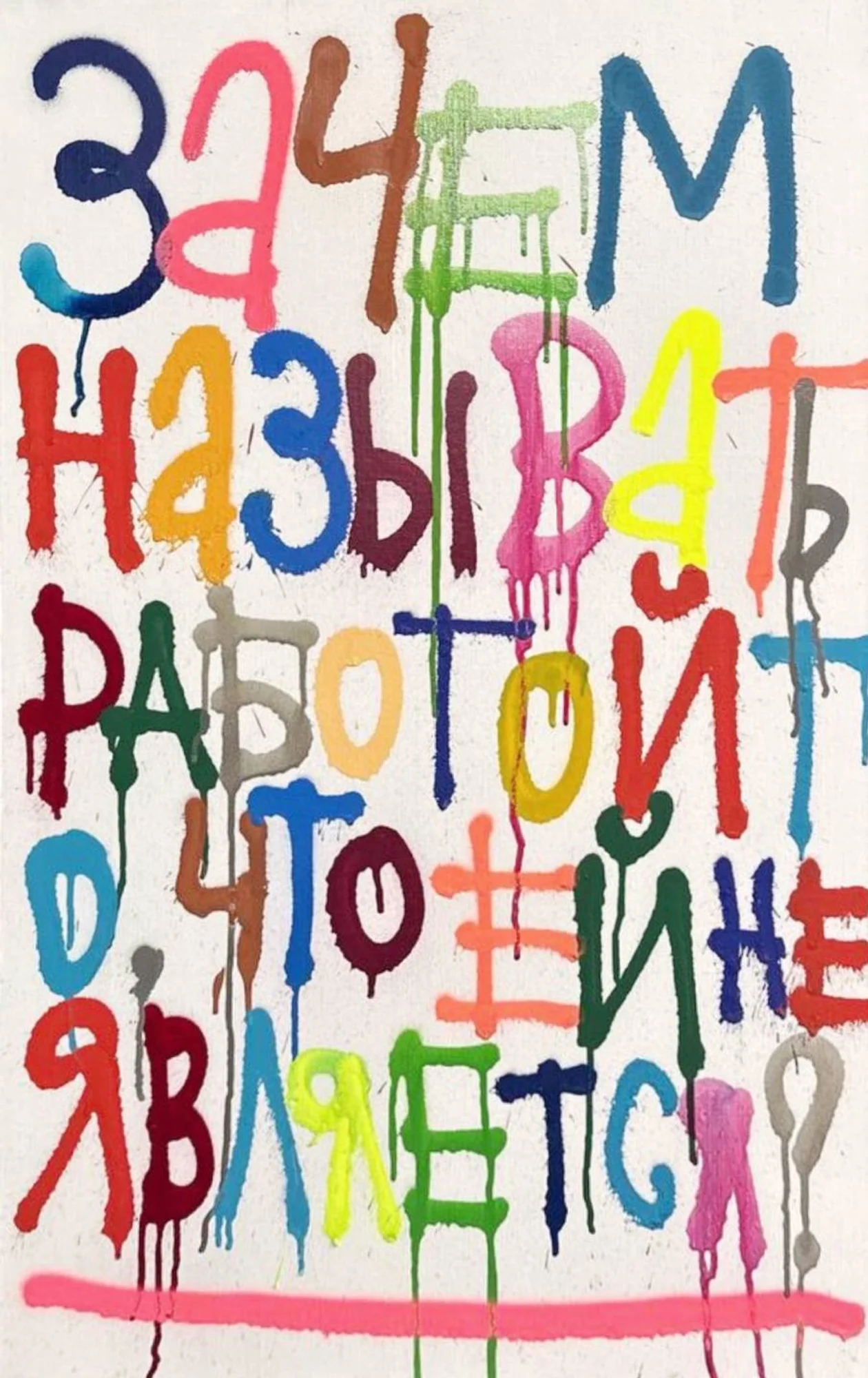 Кирилл Кто — один из самых узнаваемых современных уличных художников России. Его работы легко узнать по ярким разноцветным буквам и ироничным, философским или пессимистичным текстам. Часто он использует игру слов и рефлексию над самим собой и обществом. Участник легендарных граффити-групп «Зачем?» и No Future Forever. Создатель оформления пешеходного перехода от Курского вокзала к «Винзаводу». В новой персональной выставке он обсуждает одну из самых актуальных общественных проблем — тему бессмысленности труда.