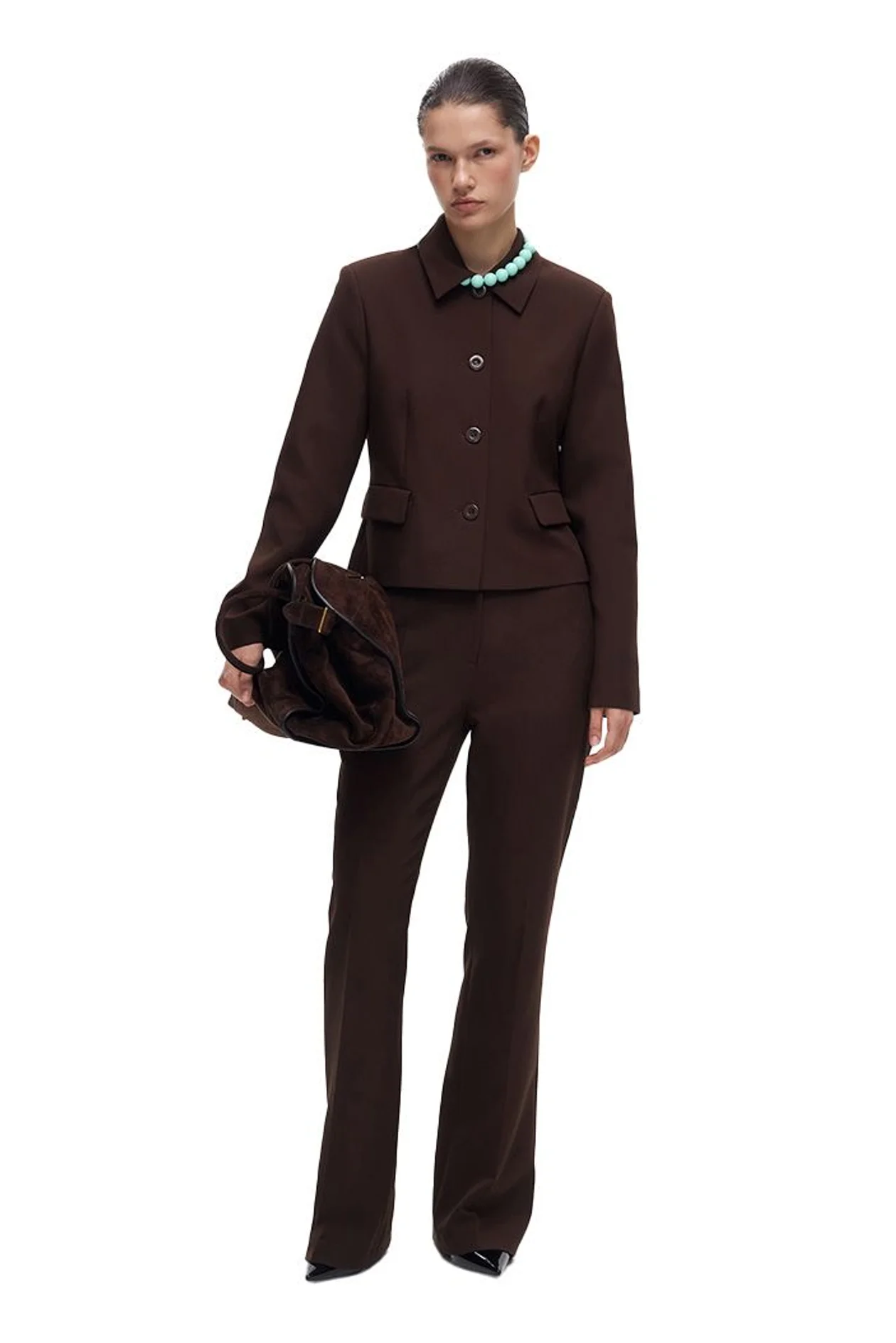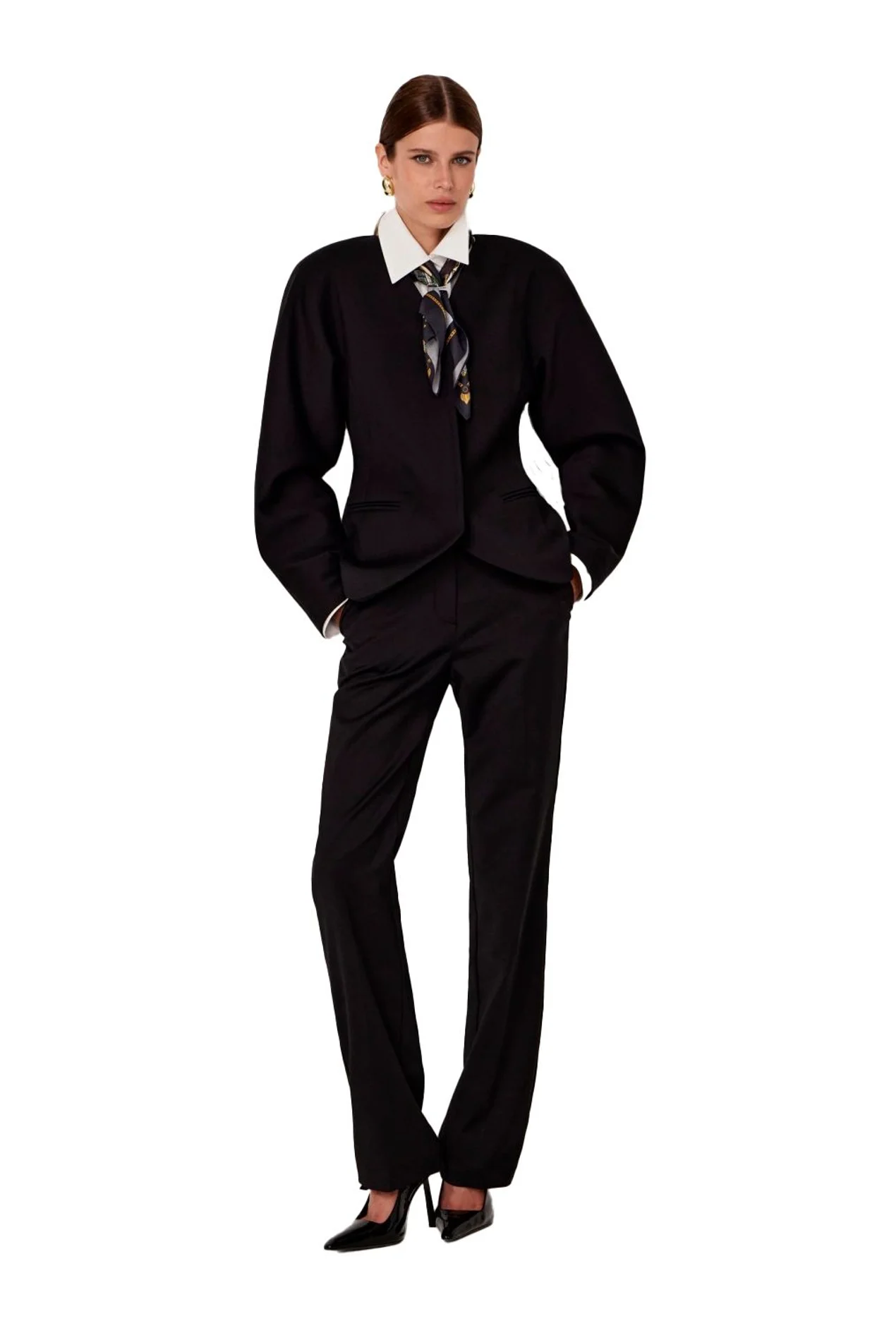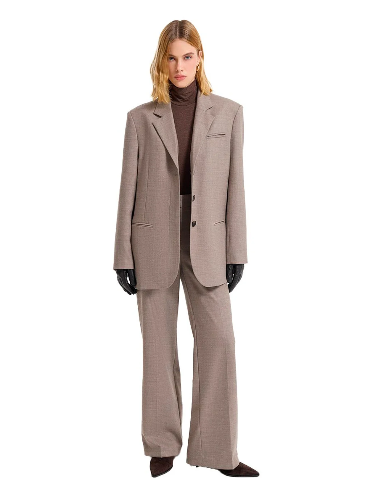Даже самые железные леди устают от эталонного пауэр-дрессинга с его квадратными плечами, оверсайзом и нарочито маскулинной составляющей. Если нужно отдохнуть от него, у Nude Story есть пара из итальянской вирджинской шерсти с уклоном в женственность: у пиджака — мягкий овальный приталенный силуэт, у брюк — высокая посадка и зауженный крой. Впрочем, все вместе выглядит настолько удачно и весомо, что нисколько не мешает своей обладательнице транслировать независимость и уверенность в себе.