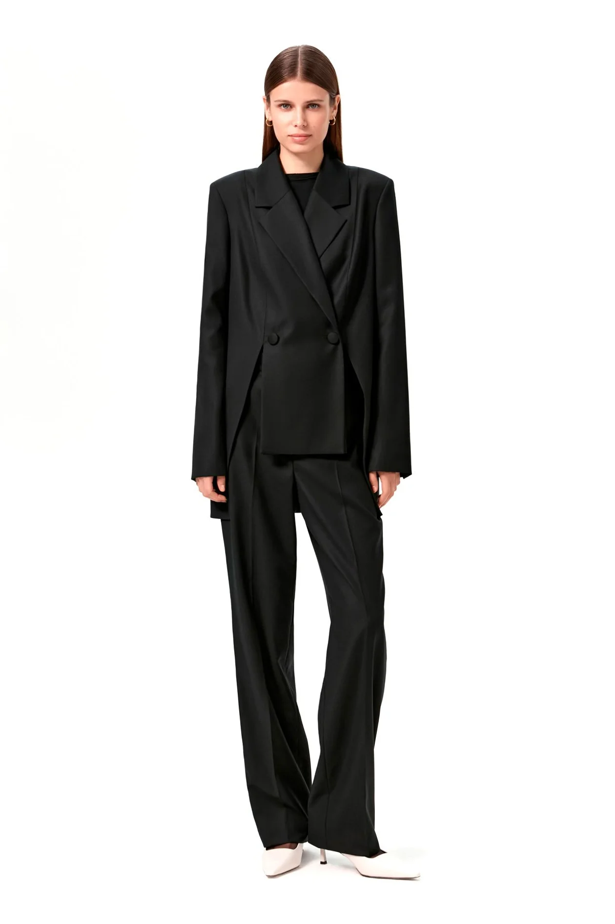 Если же вы, напротив, рассчитываете на поблажки, вам придется по душе компромиссная версия от Aline. Считать строгие мужские интонации в костюме из смесовой шерсти труда не составляет, но акцентные декоративные пуговицы вносят свою лепту, задавая офискору игривый тон. Выходит аутфит «и нашим, и вашим»: такой ловко минует преграды делового дресс-кода, уместно смотрясь в офисе, а заодно скажет свое слово, когда понадобится попасть с корабля на бал — например, забежать на пару-тройку коктейлей после трудового дня.