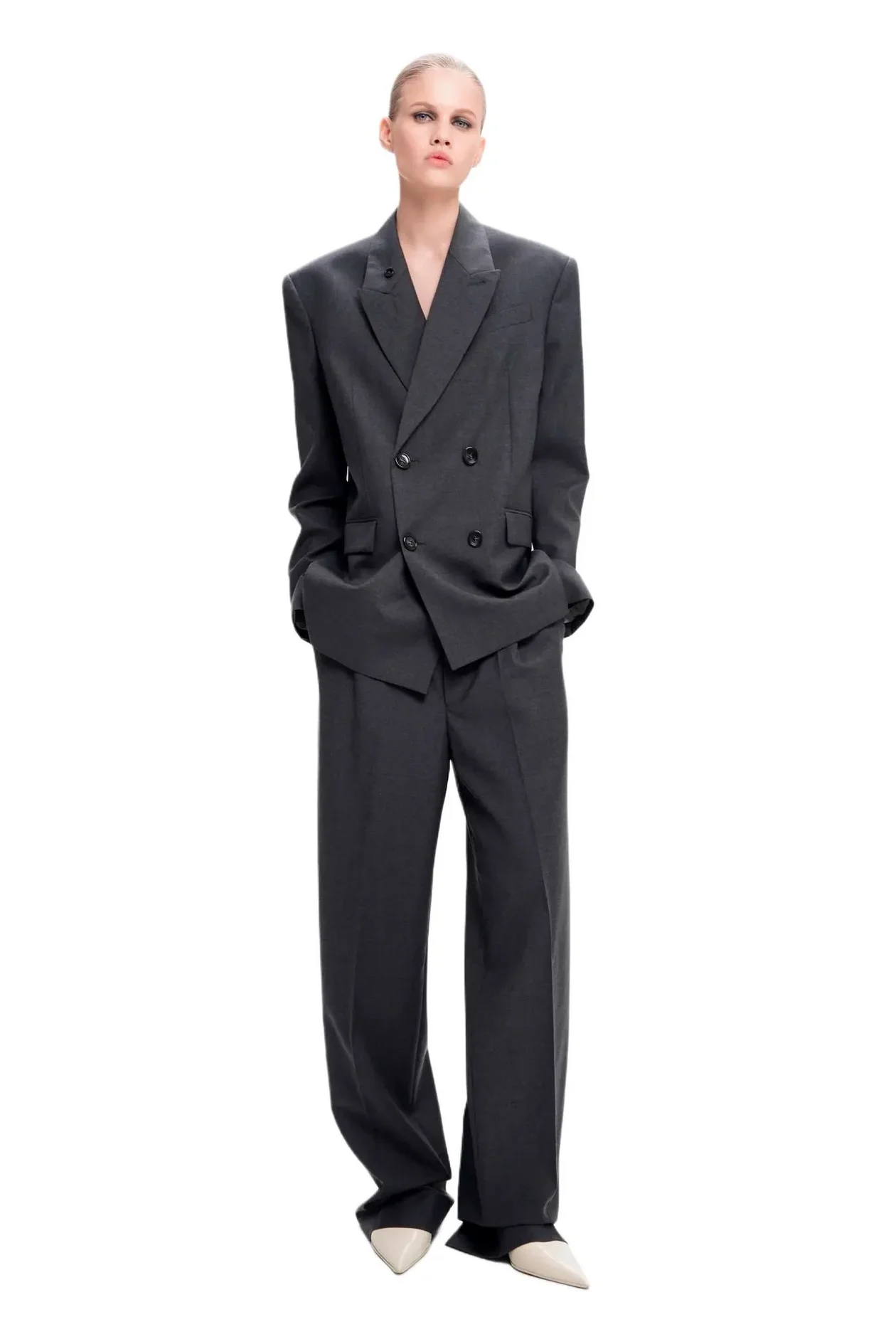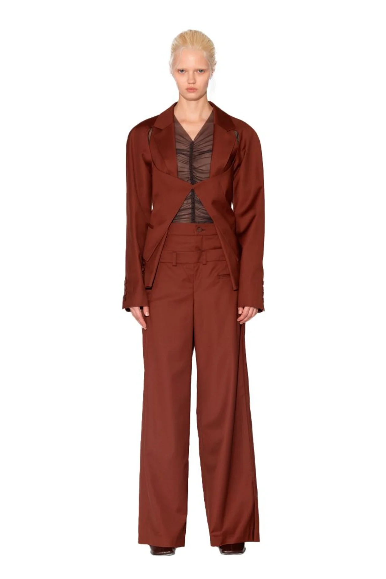 Red September не были бы самими собой, если бы подошли к делу в строгом соответствии с законами костюмного жанра. Никаких шаблонных мыслей на тему тейлоринга от бренда, поставившего все на деконструкцию, не ждите. А вот чтобы перевернуть все вверх дном и оставить шиворот-навыворот — это пожалуйста. У вас не двоится в глазах: это у пиджака двойные рукава, а у брюк — фирменный редсептембровский крой «двойной пояс» с эффектом двух пар, объединенных в одну модель. От классики остался разве что материал: и то, и другое выполнено из костюмной ткани с добавлением шерсти.