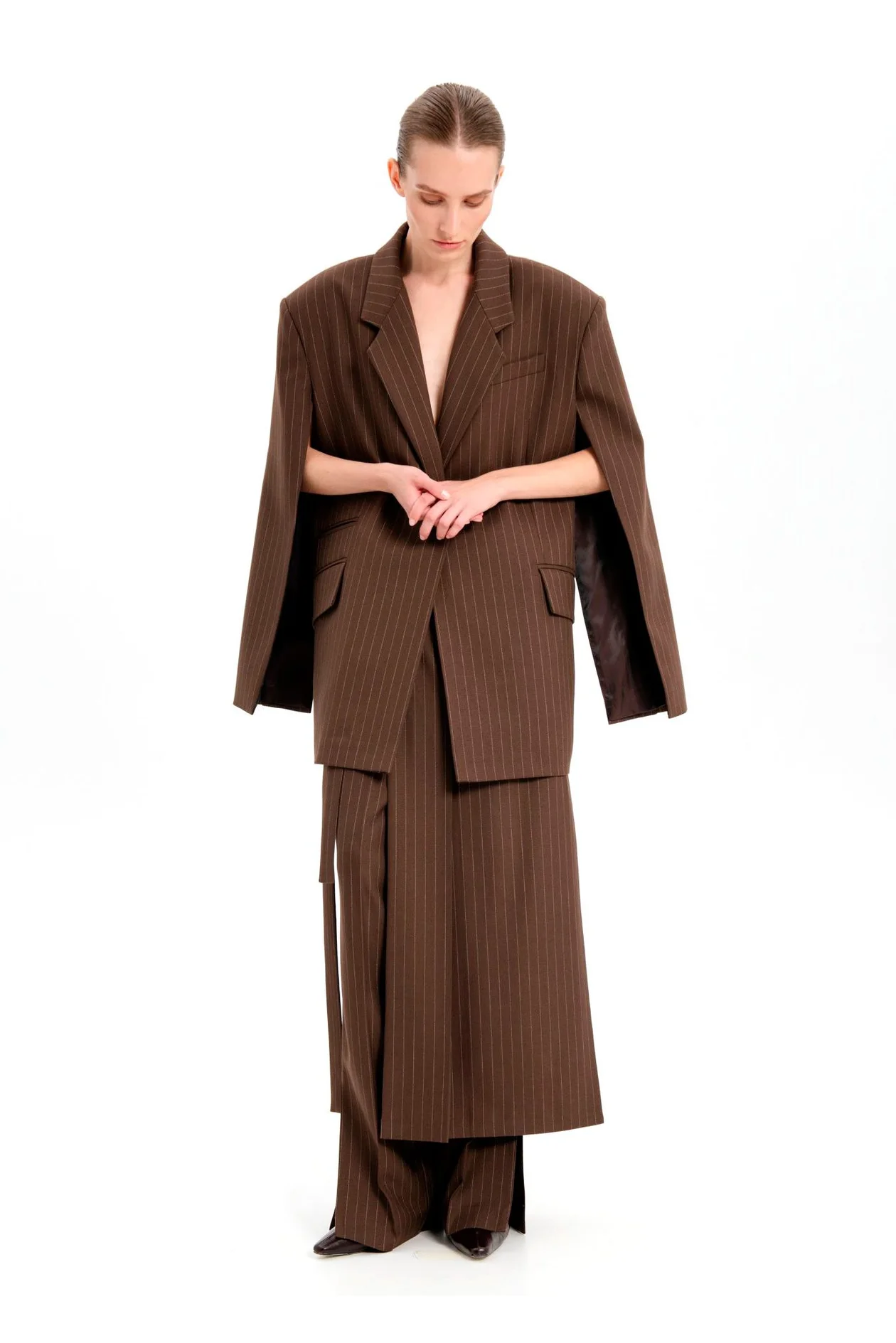 И снова о том, что за фасадом сильной личности порой прячется хрупкая натура с правом на слабости. У шоколадного жакета-кейпа в полоску — оверсайз силуэт и строгие пропорции, задающие мужской вектор, но стоит рукавам раскрыться, и вот уже «летящей походкой ты вышла из мая». Носим в паре с брюками на низкой посадке с разрезами, а если включить в образ еще и баску длины миди из того же набора, будем совсем молодцы.