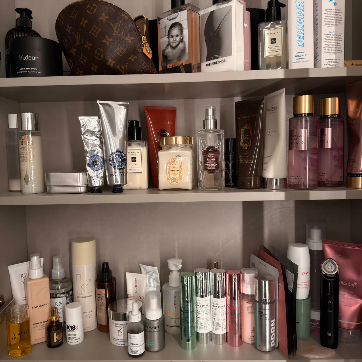 В моем постоянном уходе всегда есть четыре этапа: очищение, сыворотка, крем и спрей — именно наслаивание компонентов спасает мою кожу от воздействия частых макияжей. Мои мастхэвы — пенка и крем с SPF от Genosys, мист с ПДРН и микроиглами от VT Cosmetics и сыворотка с микроиглами для стойкого сияния кожи Reedle Shot 100 и 300.