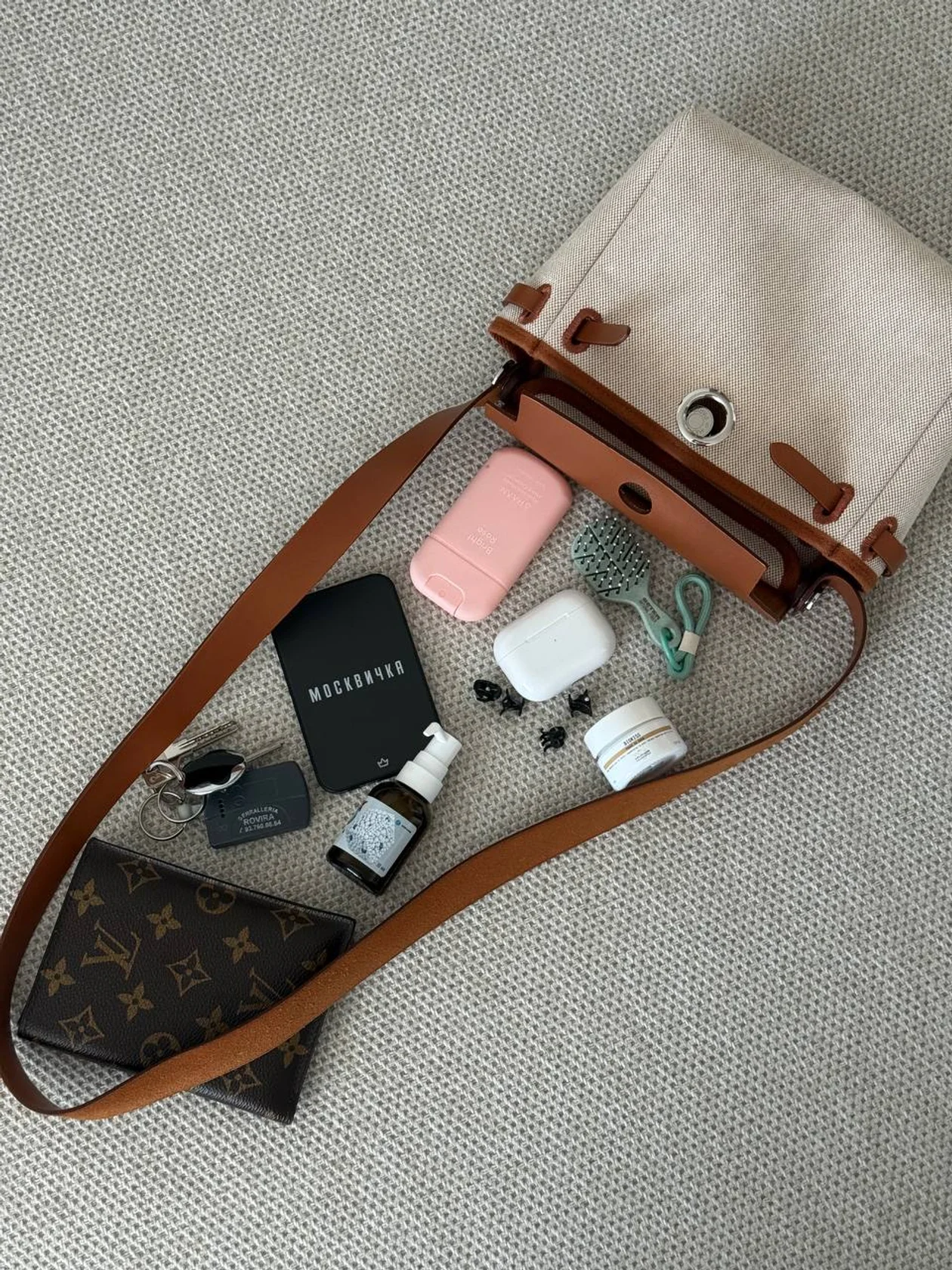 Я фанат мини- и микросумочек. Большую беру с собой только в дорогу, путешествия либо же если меня ждет насыщенный день. В целом на прогулку и для обычного выхода из дома стандартный вариант — это всегда что-то маленькое, что можно повесить на плечо. Размер диктует правила, поэтому ничего лишнего. В сумке обязательно лежит пауэрбанк: я провожу в телефоне 24 часа в день, батарейка всегда на исходе. А еще я всегда беру с собой любимый бальзам, без которого невозможно выйти дома: не люблю чувство сухости губ.