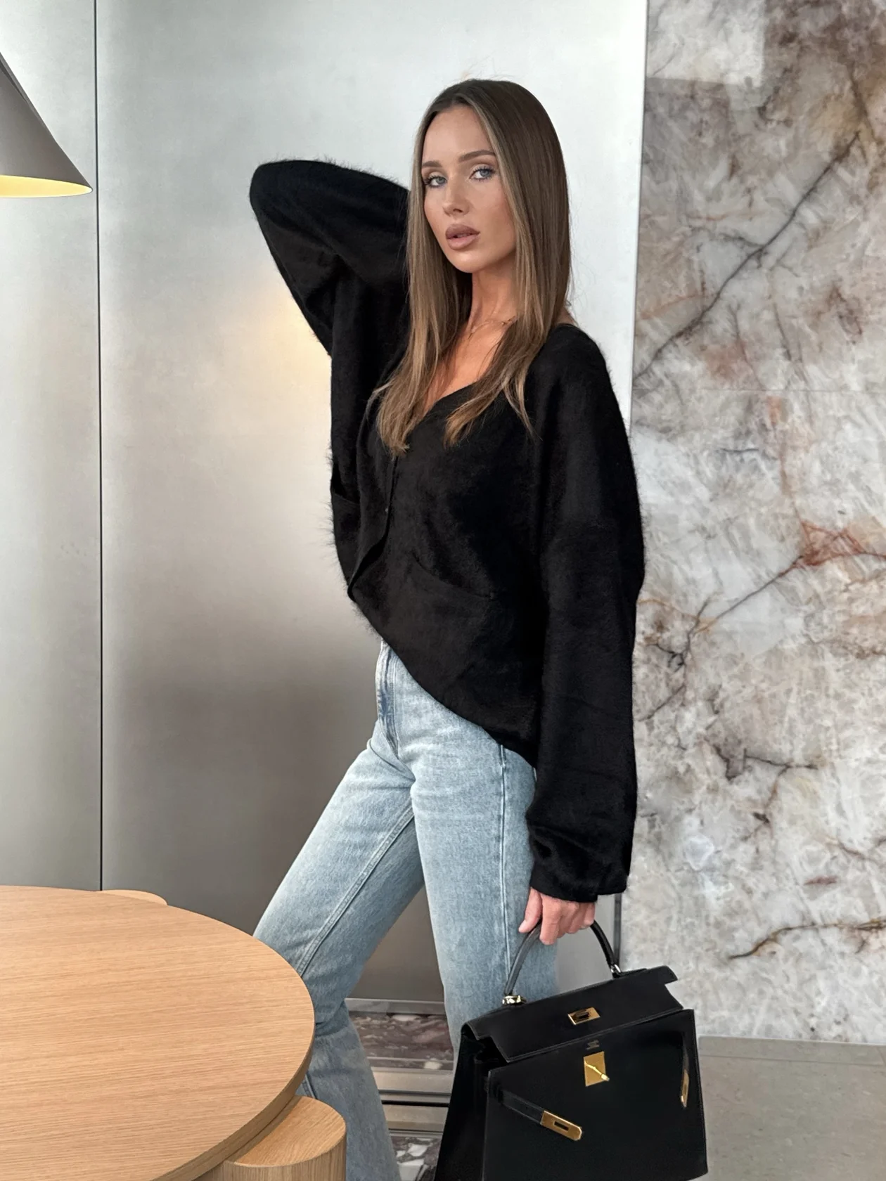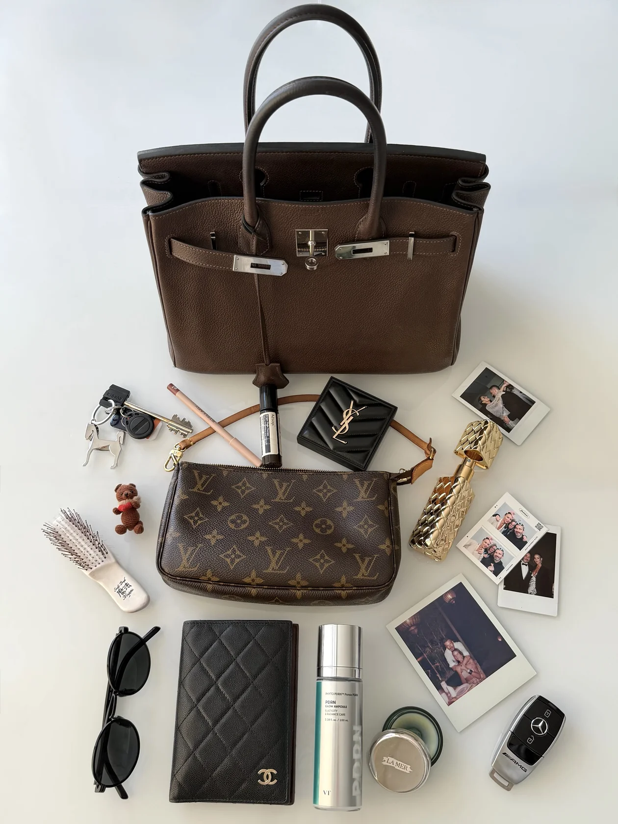 Чаще всего ношу Birkin 30 из кожи Barenia и в любую сумку кладу маленький клатч Louis Vuitton, который использую как косметичку. Внутри обязательно лежит успокаивающее масло Aesop с очень приятным ароматом — спасение для тревожников: наношу пару капель на запястья или шею как духи. Далее — мой любимый бальзам для губ La Mer, бесцветная пудра Yves Saint Laurent и карандаш для губ моего фирменного оттенка 05 Latte от бренда Stellary.