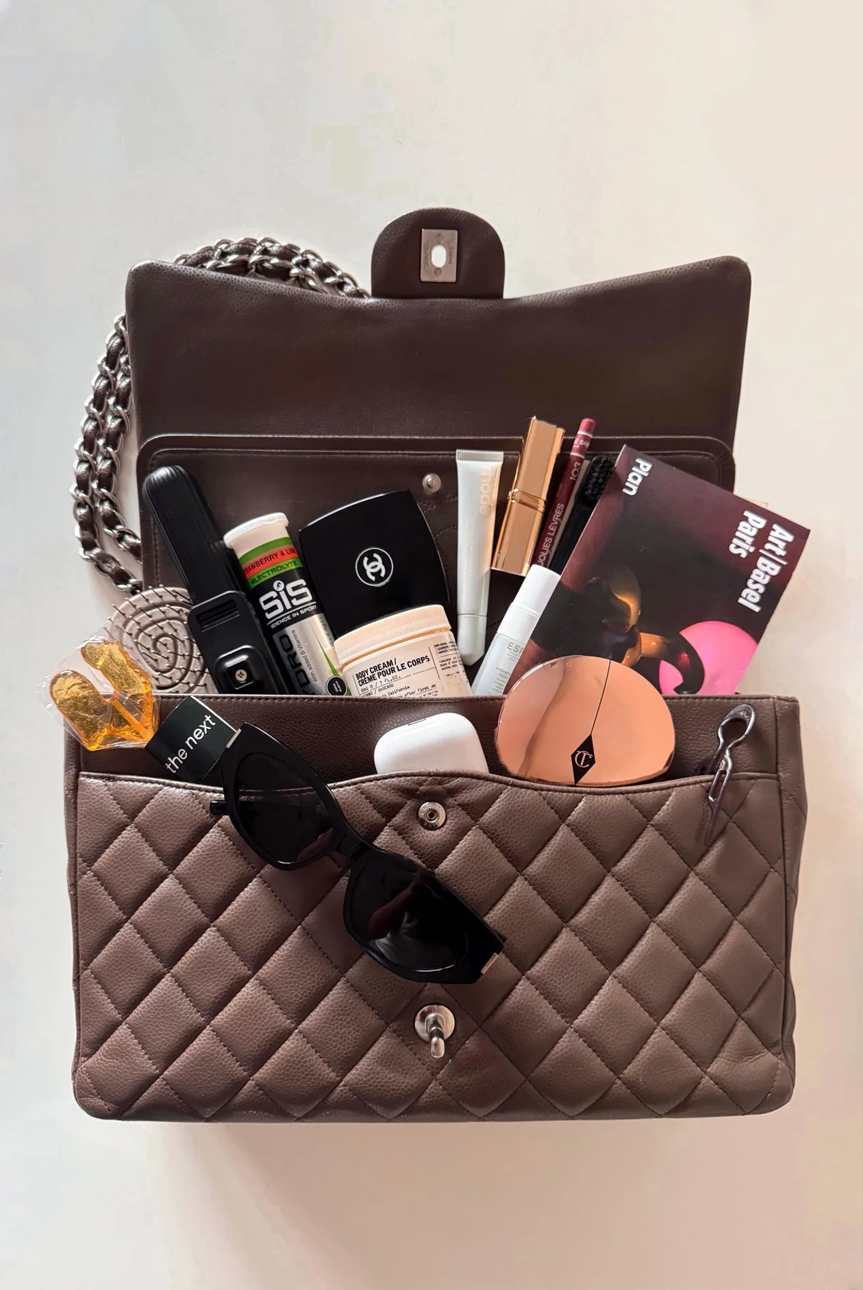В достаточно небольшую сумку Марии Chanel Classic Flap Bag помещается немало предметов, из которых складывается ее ежедневная рутина.