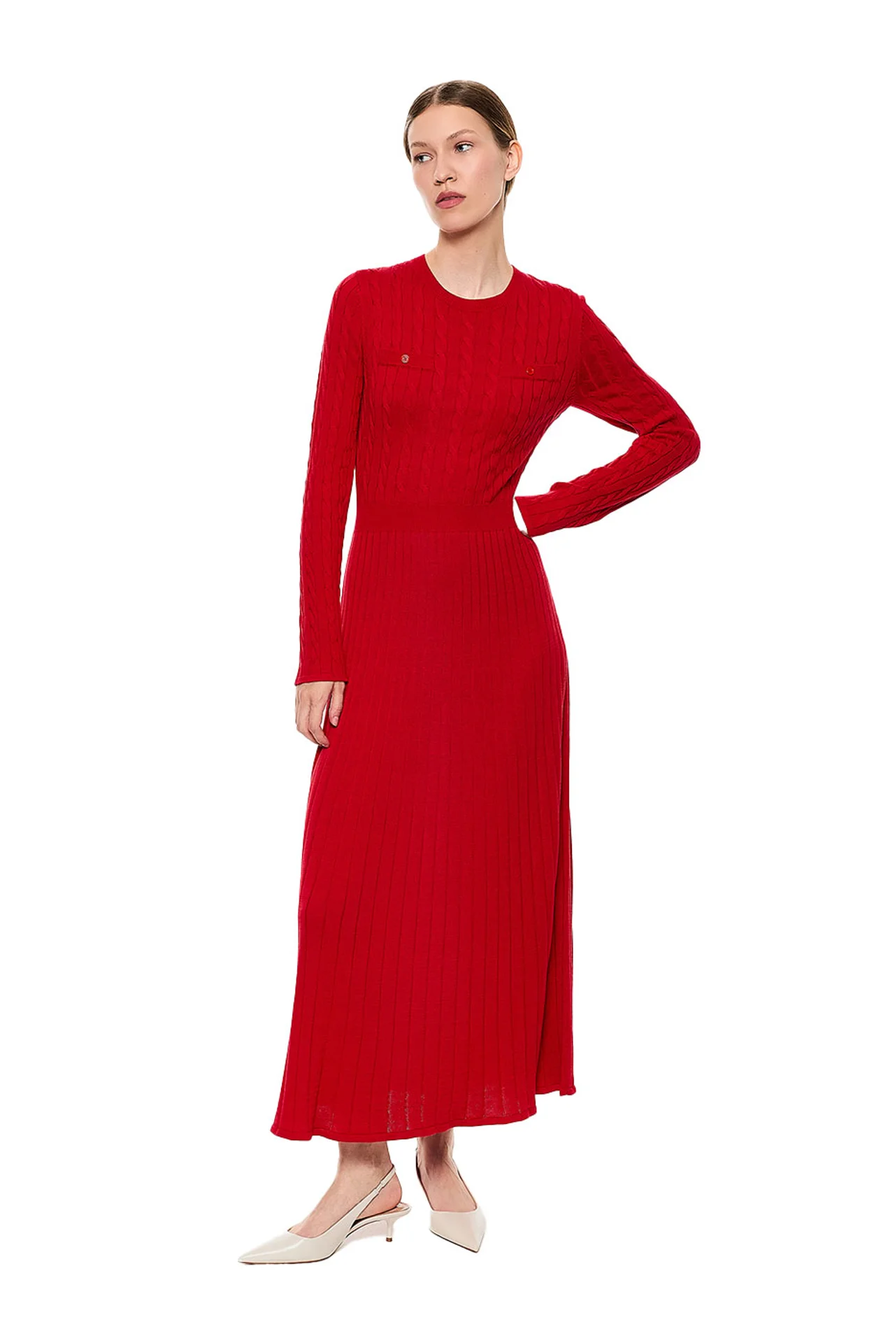 Яркий акцент для зимнего гардероба, выполненный из смеси тенселя и шелка. Тенсель — мягкая ткань из экологичной эвкалиптовой целлюлозы. Приталенный силуэт и насыщенный красный цвет превращают платье в основу для любого вашего образа.