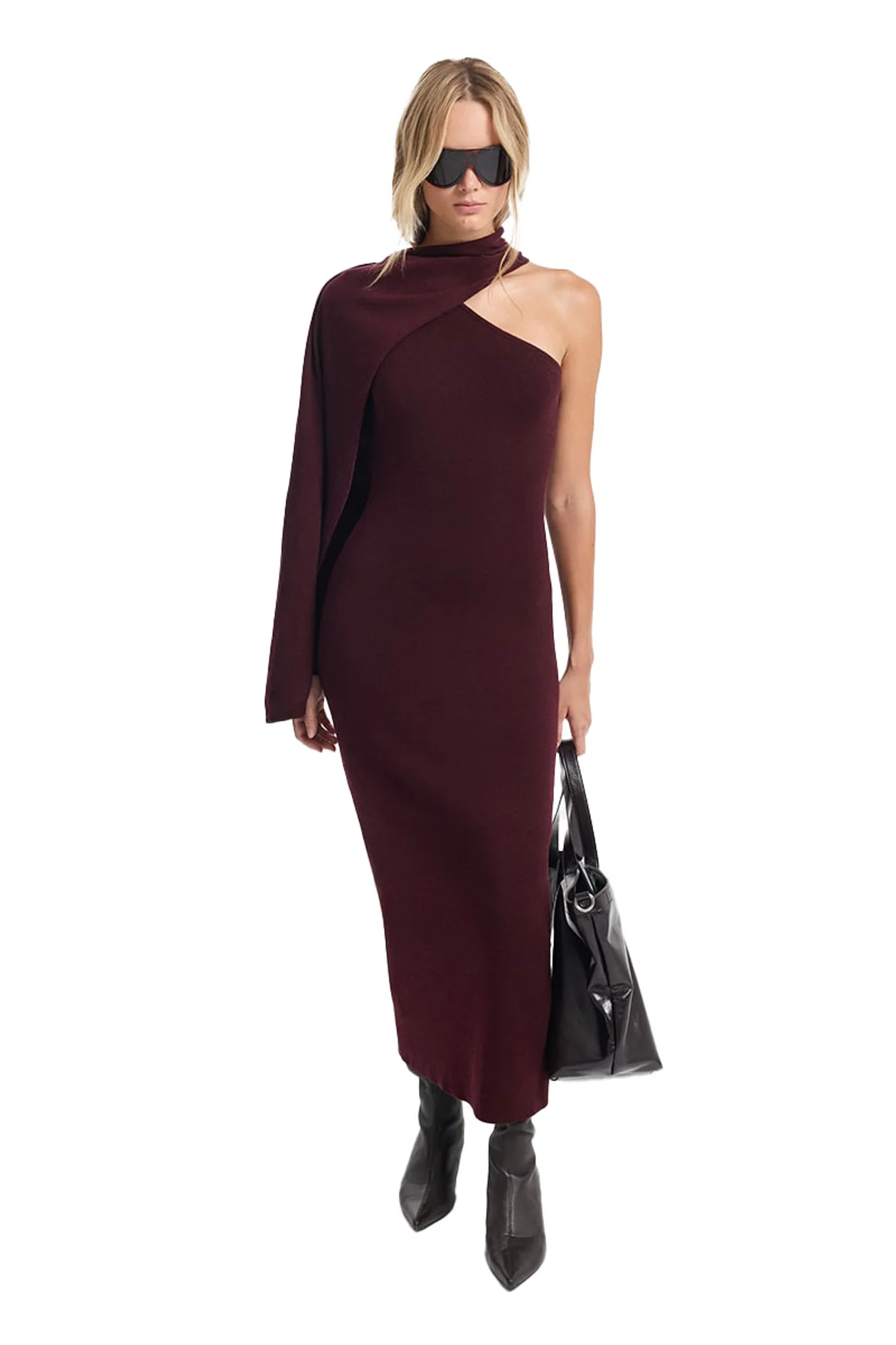 Это асимметричное платье из шерсти и тенселя подойдет на все случаи жизни. Облегающий силуэт дизайнеры бренда дополнили накидкой из аналогичной ткани на одно плечо. Получилось изящно и элегантно.