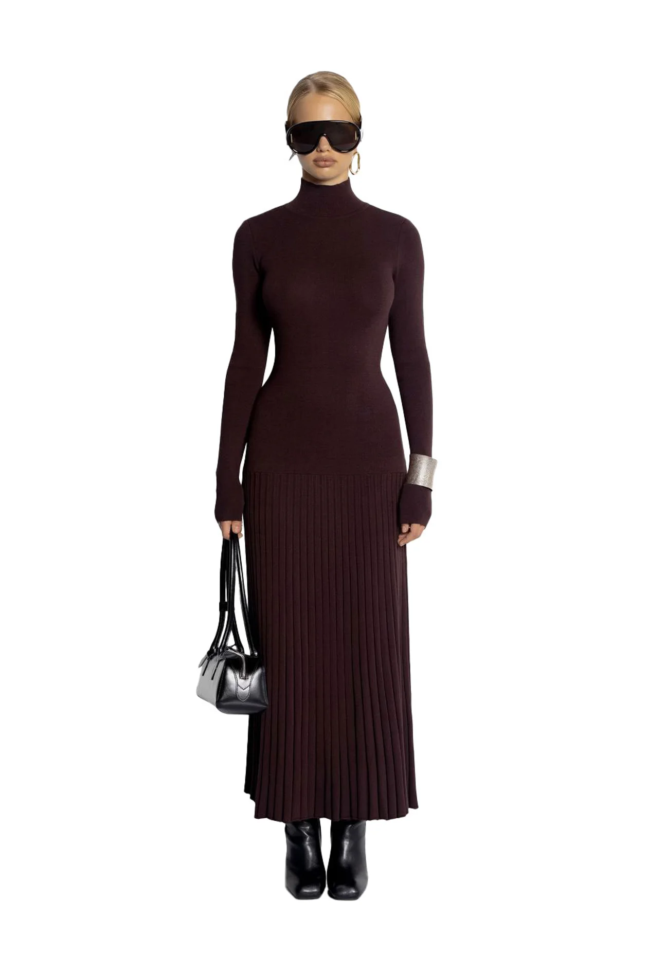 Платье-водолазка от московского бренда с юбкой-вермишелью и открытой спиной в трендовом уже несколько сезонов шоколадном цвете. Основная нить платья вискозная — это значит, что в нем будет комфортно и в верхней одежде, и в помещении. Но в идеале, конечно, скинуть с себя верхние слои и щеголять акцентной спиной.