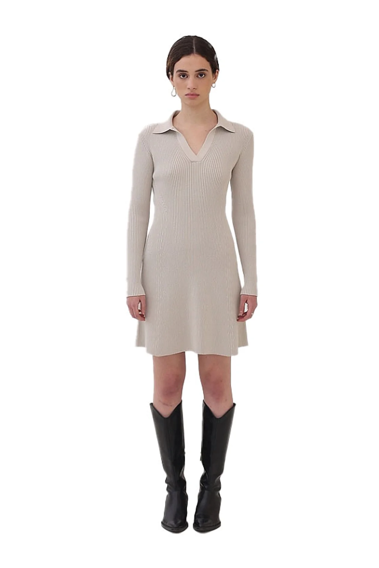 Дарья считает, что к трикотажным платьям уместны варианты и высокой, и низкой обуви. Сапоги-ботфорты, угги, челси, ботинки на грубой подошве — выбирайте любую пару.