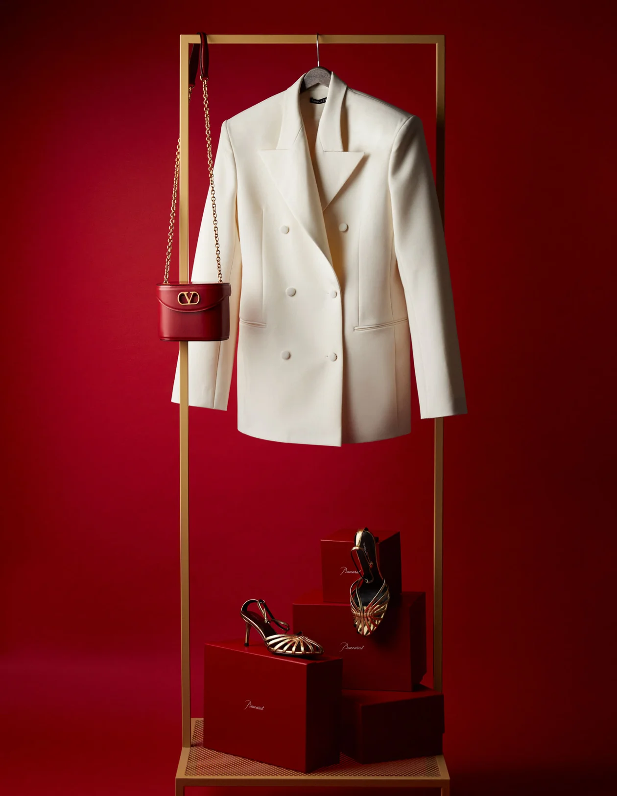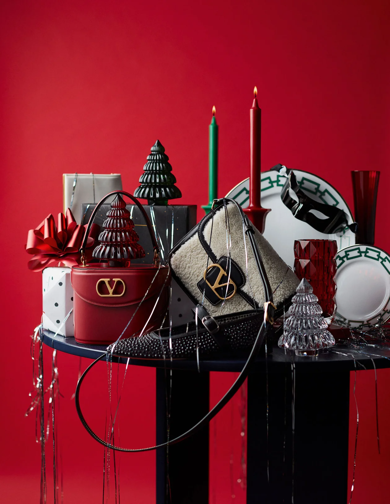 Стол RND 02 из МДФ и шпона, KONOS STUDIO; сумки Vain и 9TO5, VALENTINO, балетки, LE MONDE BERYL, клатч Metis, NEOUS, хрустальные скульптуры «Ель», ваза Louxor и восковые свечи Harcourt, BACCARAT, все ЦУМ; упаковочная бумага, O PAPER PAPER; фарфоровые тарелки, GINORI 1735, BOSCOCASA; латунная маска Melody с шелковой лентой, AGENT PROVOCATEUR.