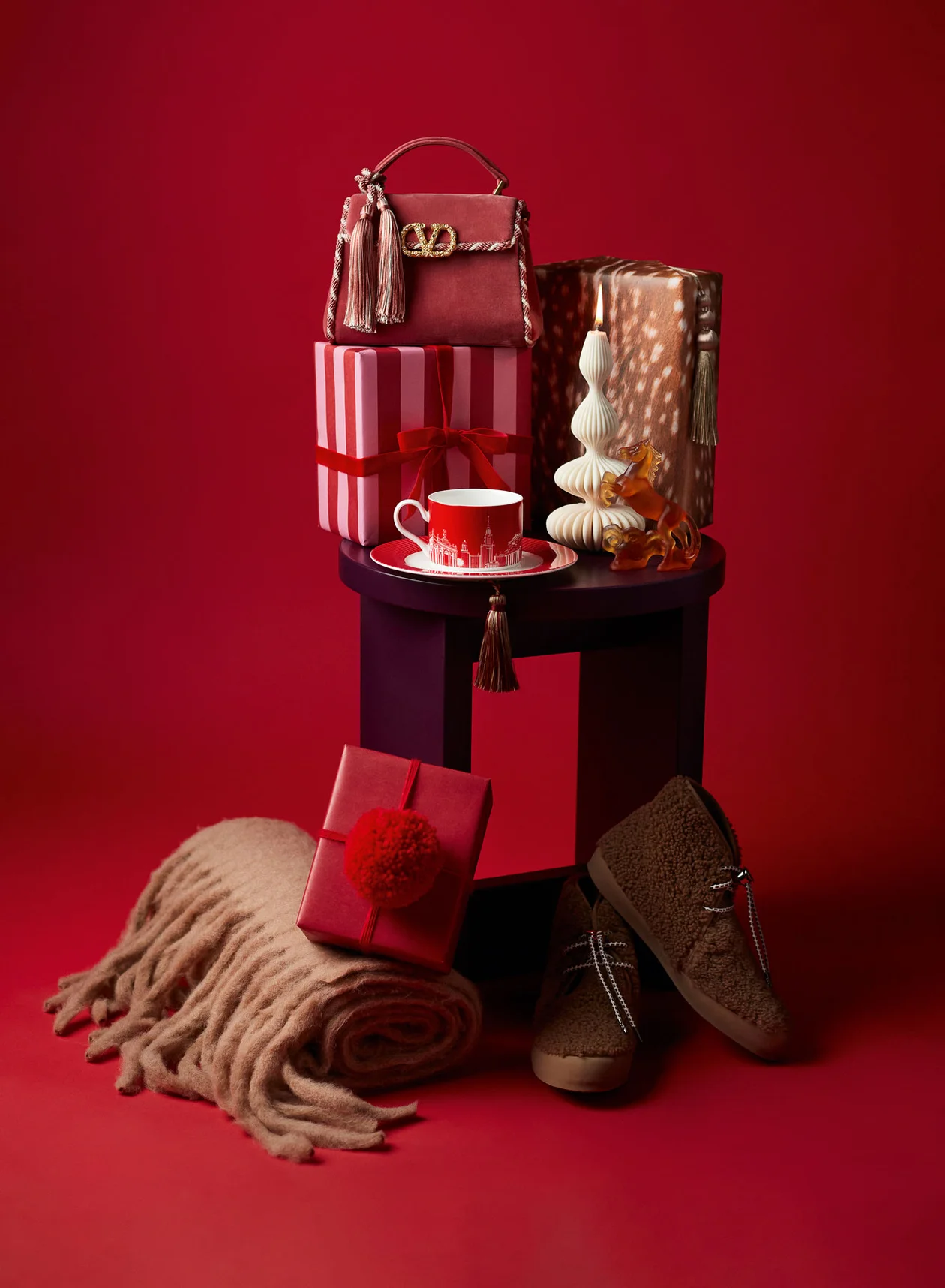 Табурет Rec 01 из МДФ, KONOS STUDIO; бархатная сумка Vsling mini, VALENTINO, хрустальная скульптура Horse, Daum, ботинки Desert из овчины, LE MONDE BERYL, все ЦУМ; фарфоровая чайная пара, «МОСКОВСКОЕ ЧАЕПИТИЕ», «ДОМ ФАРФОРА»; свеча из пчелиного воска, LOVELY DAY!; шарф из альпаки, MAX MARA, BOSCO; упаковочная бумага и помпоны, O PAPER PAPER.