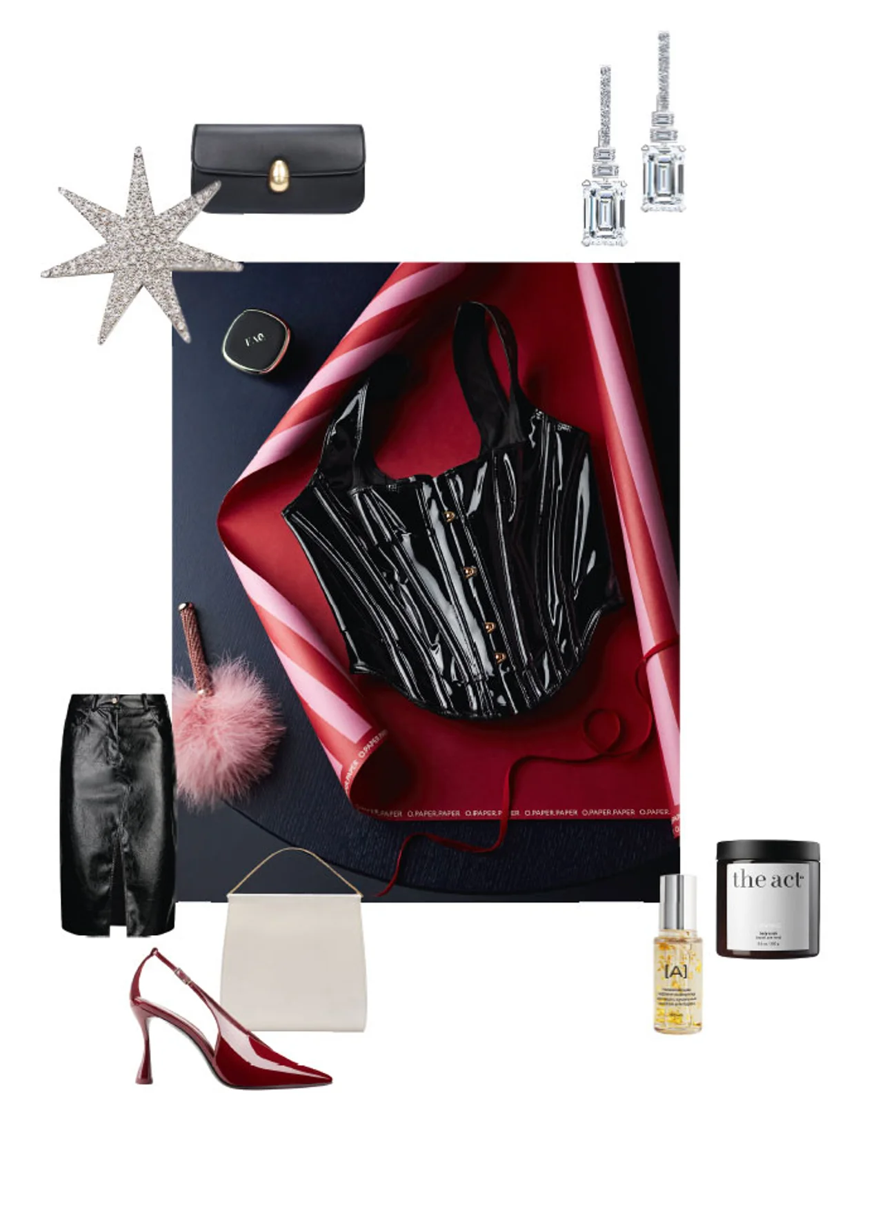 В центре: упаковочная бумага, O PAPER PAPER; корсет Zena из полиэстера, тиклер Zoelle, AGENT PROVOCATEUR; массажер для головы, ускоряющий рост и восстанавливающий густоту волос, FOREO FAQ 302.