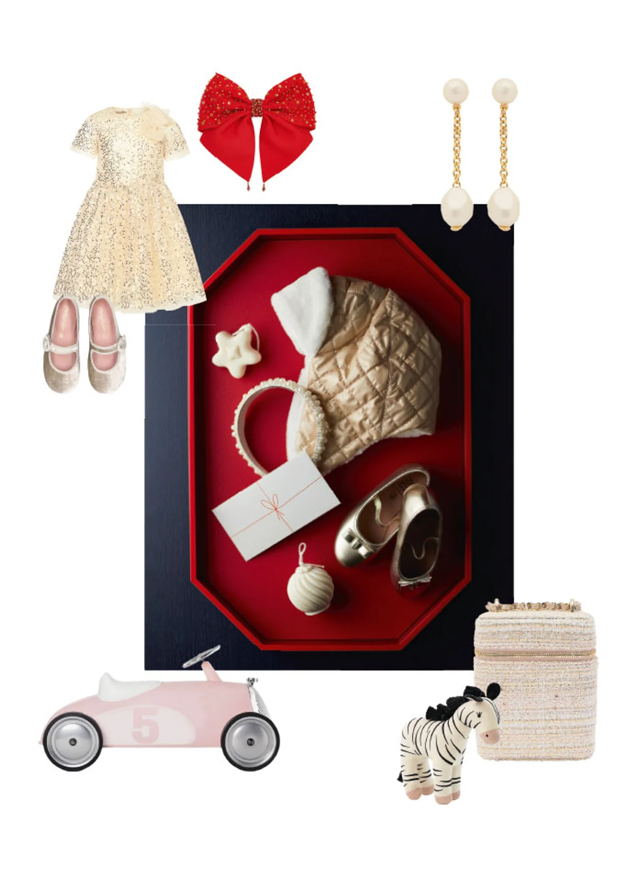 В центре: шапка-ушанка из полиэстера, TOTTI, туфли из экокожи, MOTHERCARE, все MOTHERBEAR; ободок с бусинами, CHOUPETTE; свечи из пчелиного воска, LOVELY DAY!; открытка, O PAPER PAPER; поднос Octogone L из ХДФ и переработанной кожи, BACCARAT, ЦУМ.