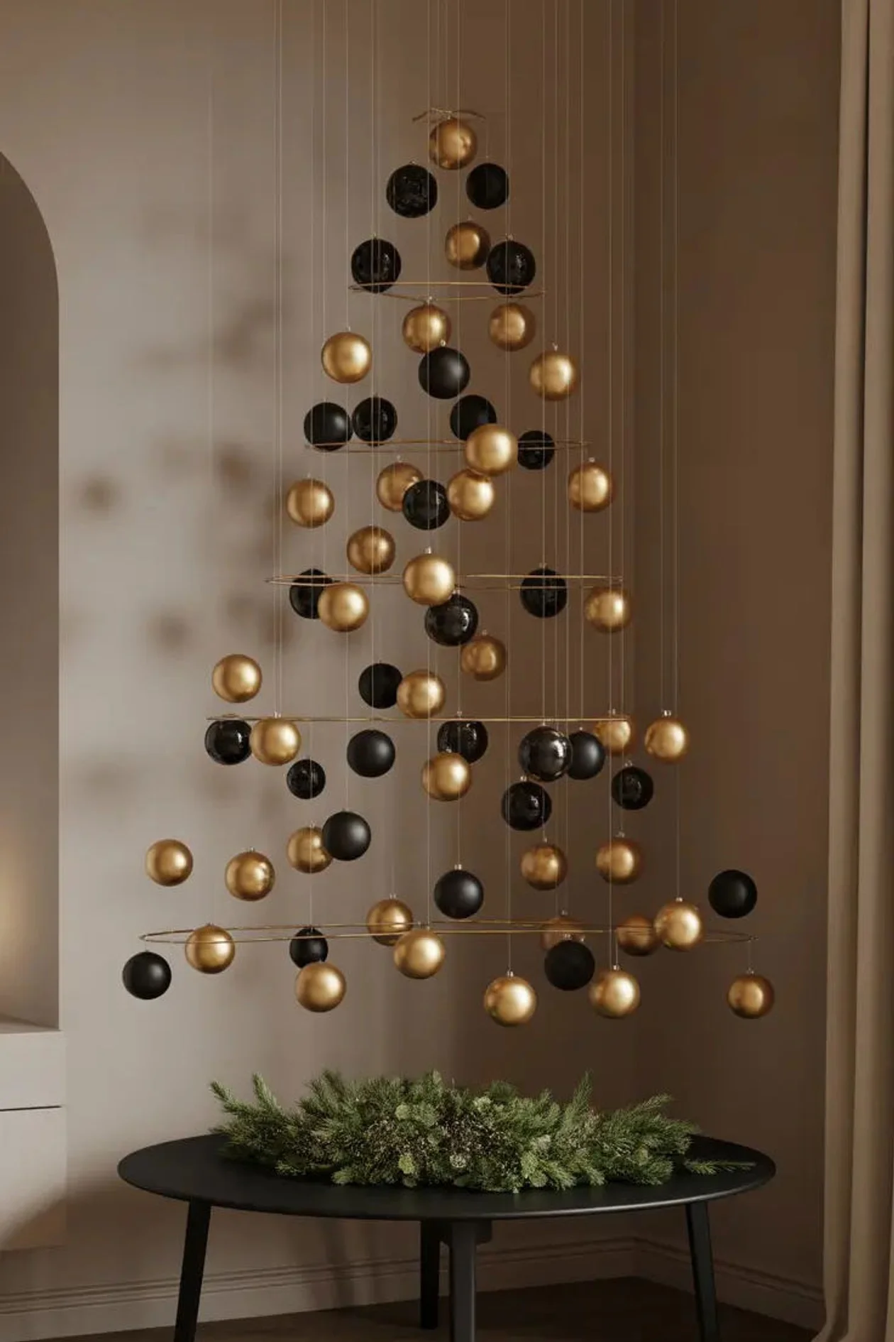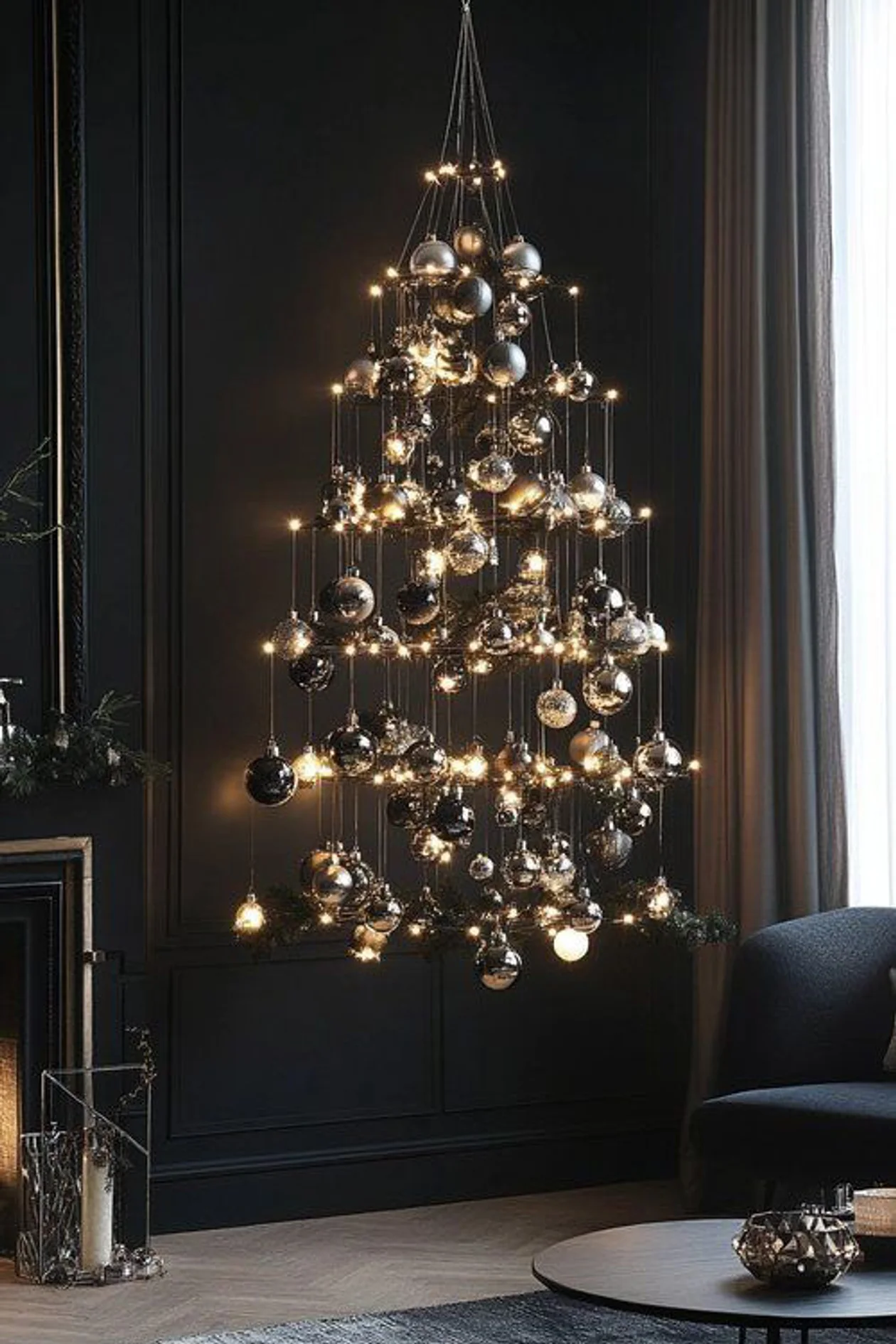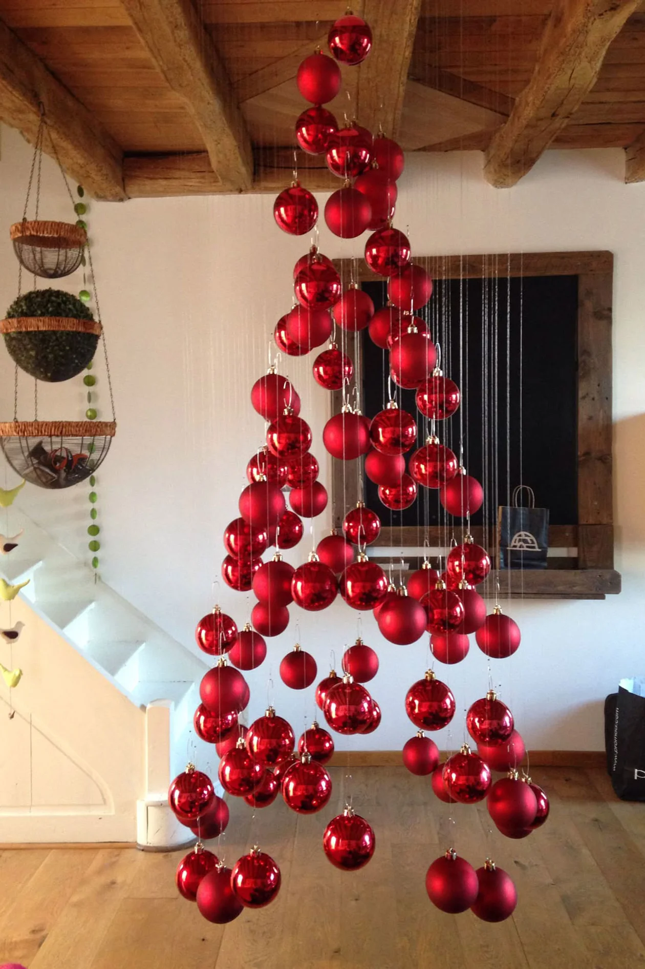 Купите несколько стеклянных шаров и других игрушек, привяжите к прозрачным лескам разной длины (от 20 до 80 см), подвесьте от потолка или карниза, формируя асимметричную пирамиду — плотнее в центре. Вставьте гирлянду внутрь.