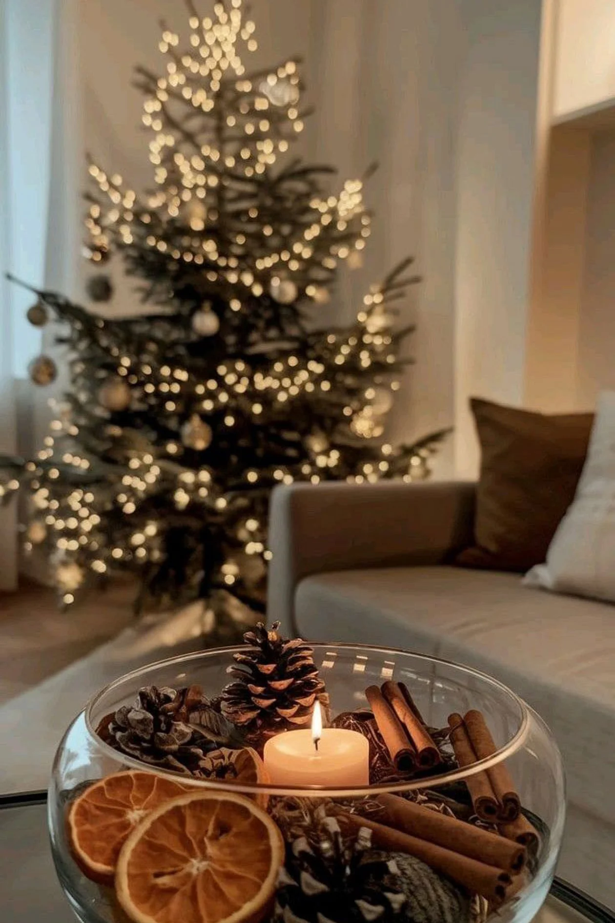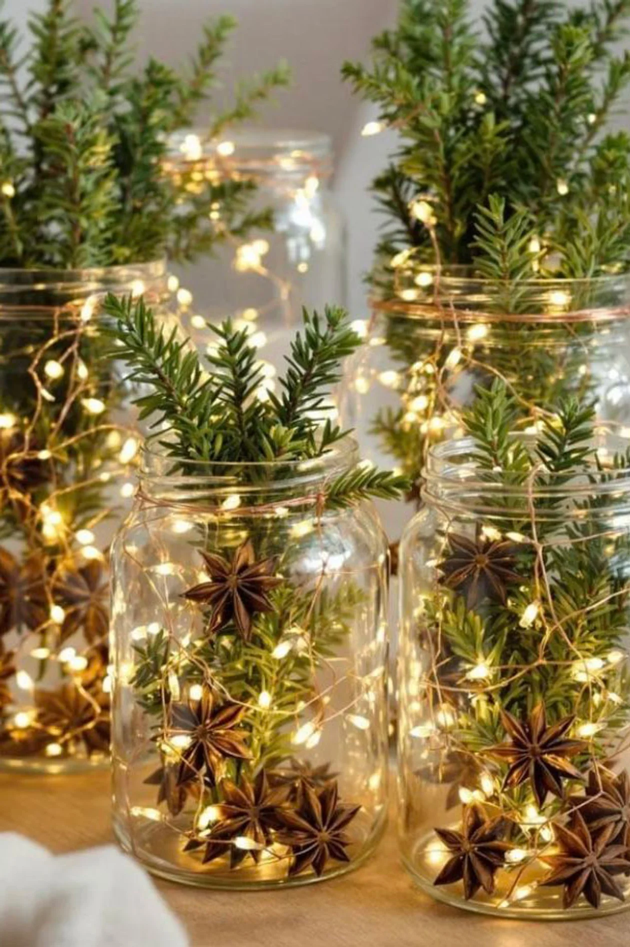 Возьмите несколько стеклянных ваз, банок или колб, положите в них шары, шишки, мишуру, веточки или гирлянду на батарейках. Главное — не заполнять емкость до краев. Когда внутри остается немного воздуха, композиция выглядит легче, а отражения стекла усиливают блеск и глубину. Для теплого эффекта добавьте одну-две светодиодные свечи или подсветку.