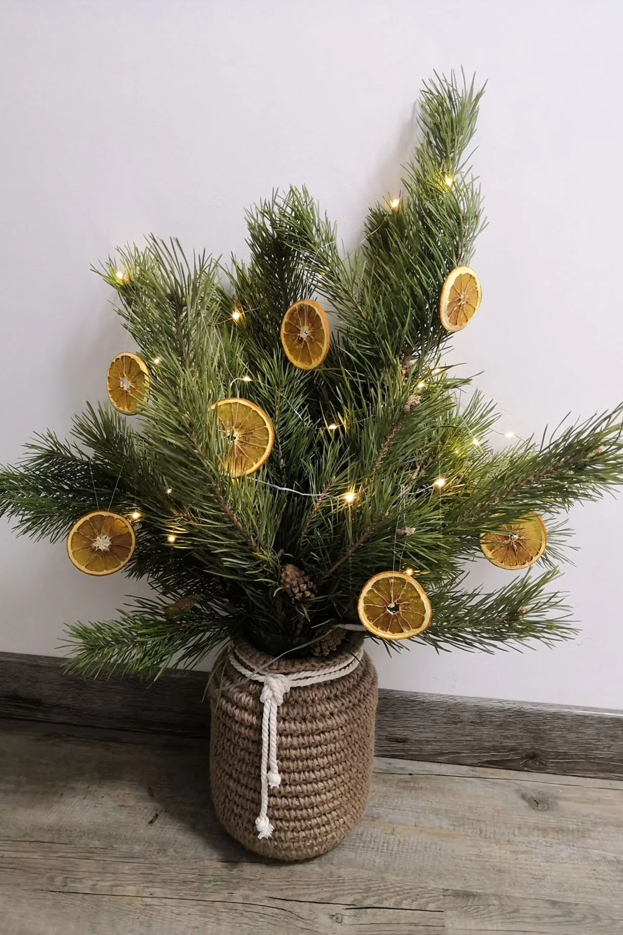 Закрепите пушистый лапник (натуральный можно найти в цветочном, искусственный — заказать на маркетплейсах) на стене прозрачными крючками или тонкой проволокой, формируя треугольник. Добавьте гирлянду с теплым светом (на батарейках, без проводов) и три – пять сушеных апельсиновых долек для аромата. По желанию развесьте небольшие игрушки и мишуру.