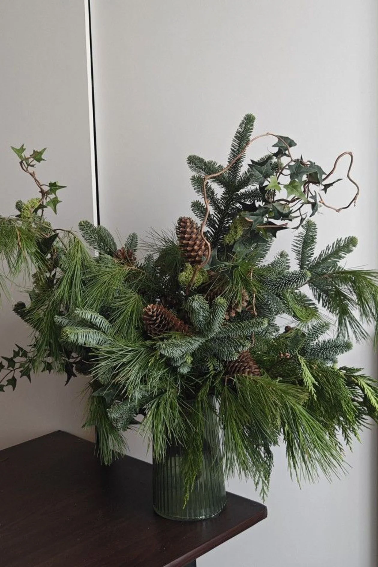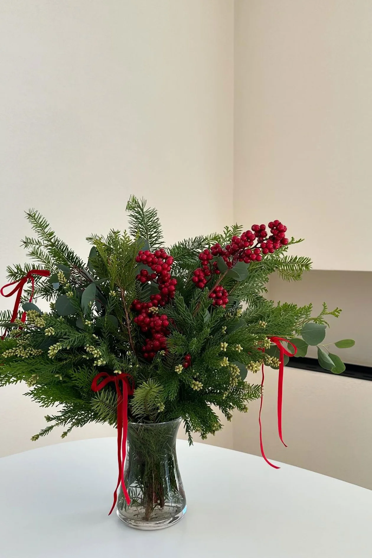 Органичный бохо-шик с многослойной текстурой — зеленый градиент, красные ягоды и бархат хвои добавляют свежести и роскоши в повседневный интерьер.