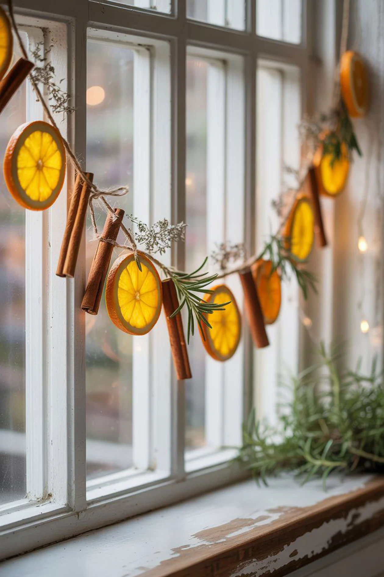 Цитрусы надо нарезать тонкими круглыми дольками и оставить сушиться в духовке часа на три-четыре при температуре 80 градусов. После проделайте в них небольшие отверстия и проденьте через эти отверстия бечевку. Чередуйте дольки с палочками корицы. По желанию можно добавить еловых или розмариновых веточек, бумажных снежинок или миниатюрных игрушек.