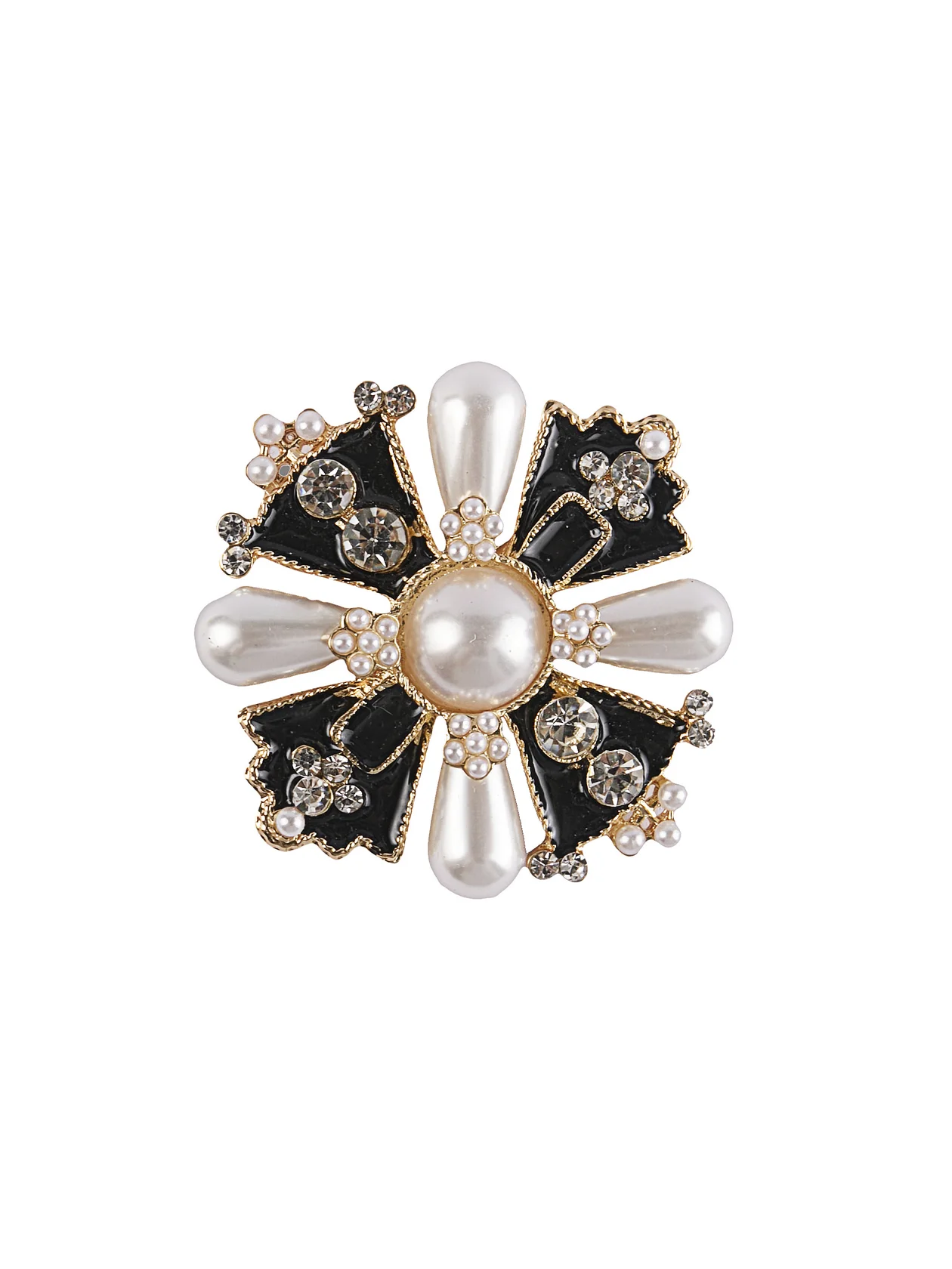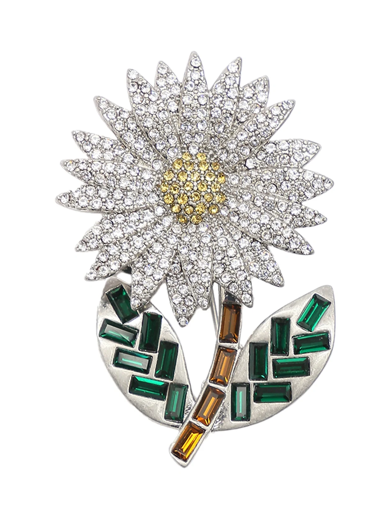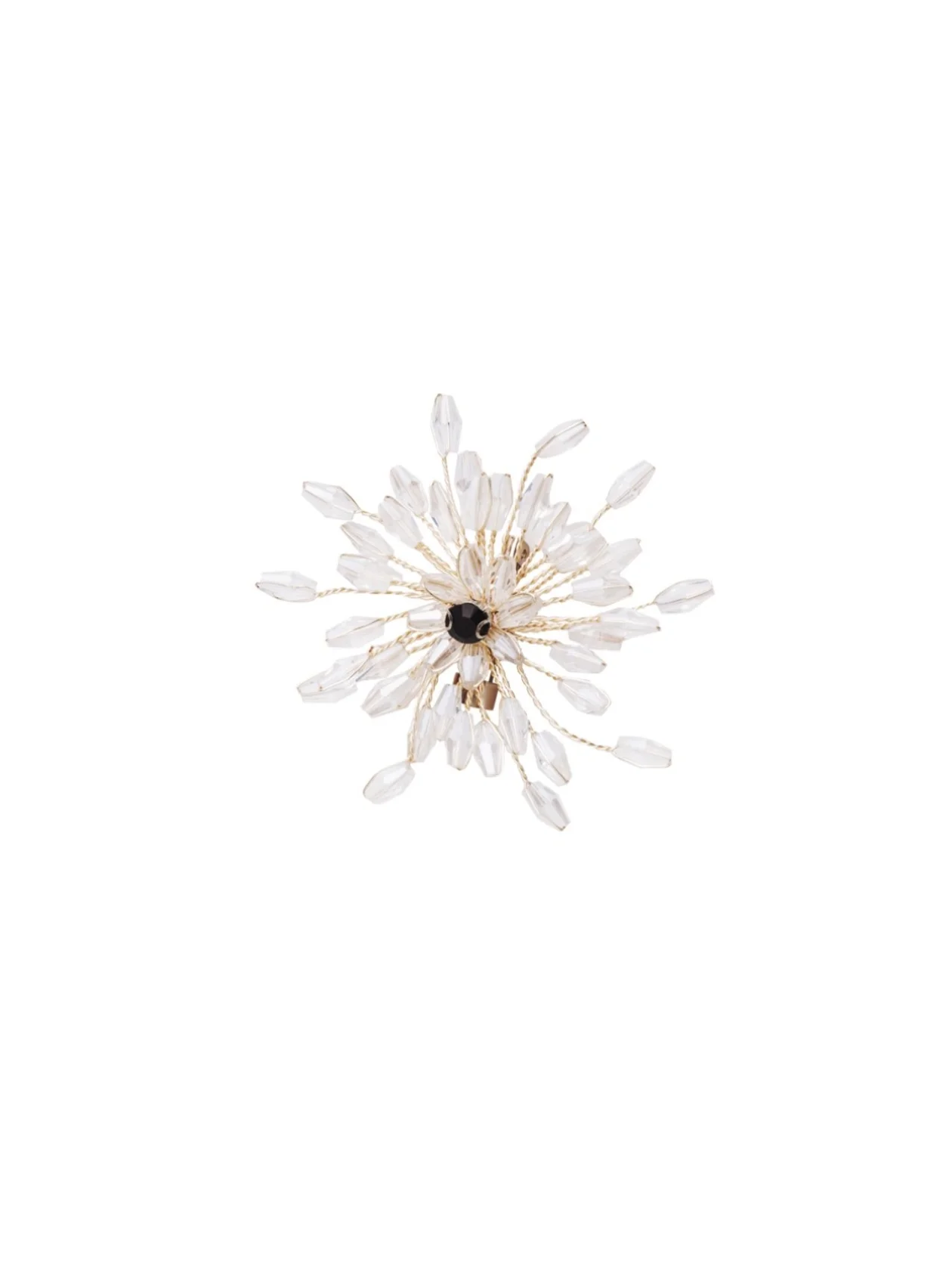 Форма цветка, граненые прозрачные бусины, белая страза в центре. Золотистая мини-булавка крепится туда, где не хватает блеска. Можно носить одну или собрать букет на лацкане — тогда вас точно заметят даже в час пик на «Кольцевой».