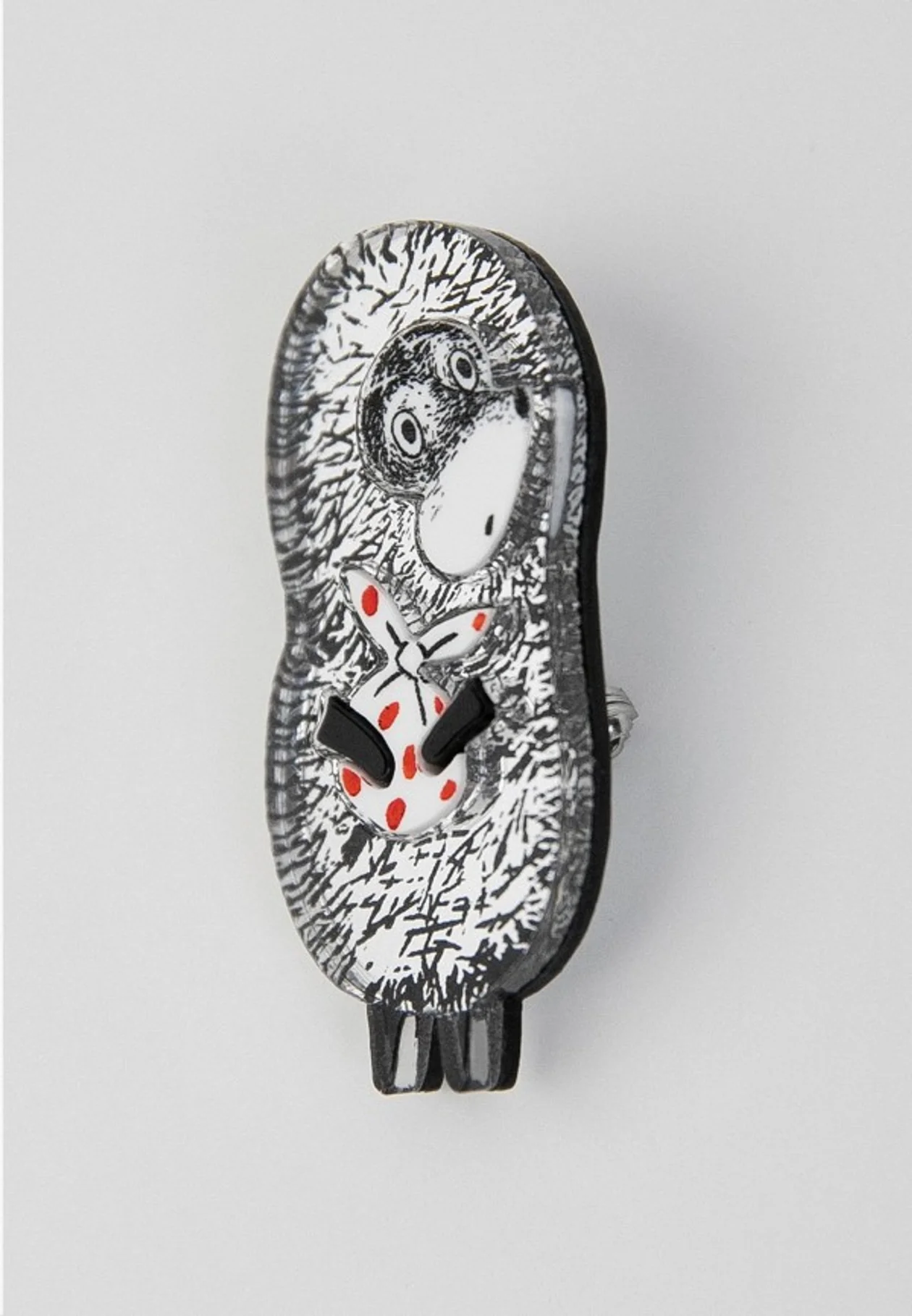 Коллаборация с «Союзмультфильмом» — легально, с лицензией, по мотивам того самого «Ежика в тумане» Юрия Норштейна. Брошь из оргстекла, зеркальные вставки, мелкие детали гравируют и прорисовывают вручную. Легкая, прочная, не жалко носить каждый день хоть на джемпере, хоть на рюкзаке. Встречайте комплименты в метро: все, кто смотрел мультфильм в детстве, захотят обсудить, куда подевалась лошадка.