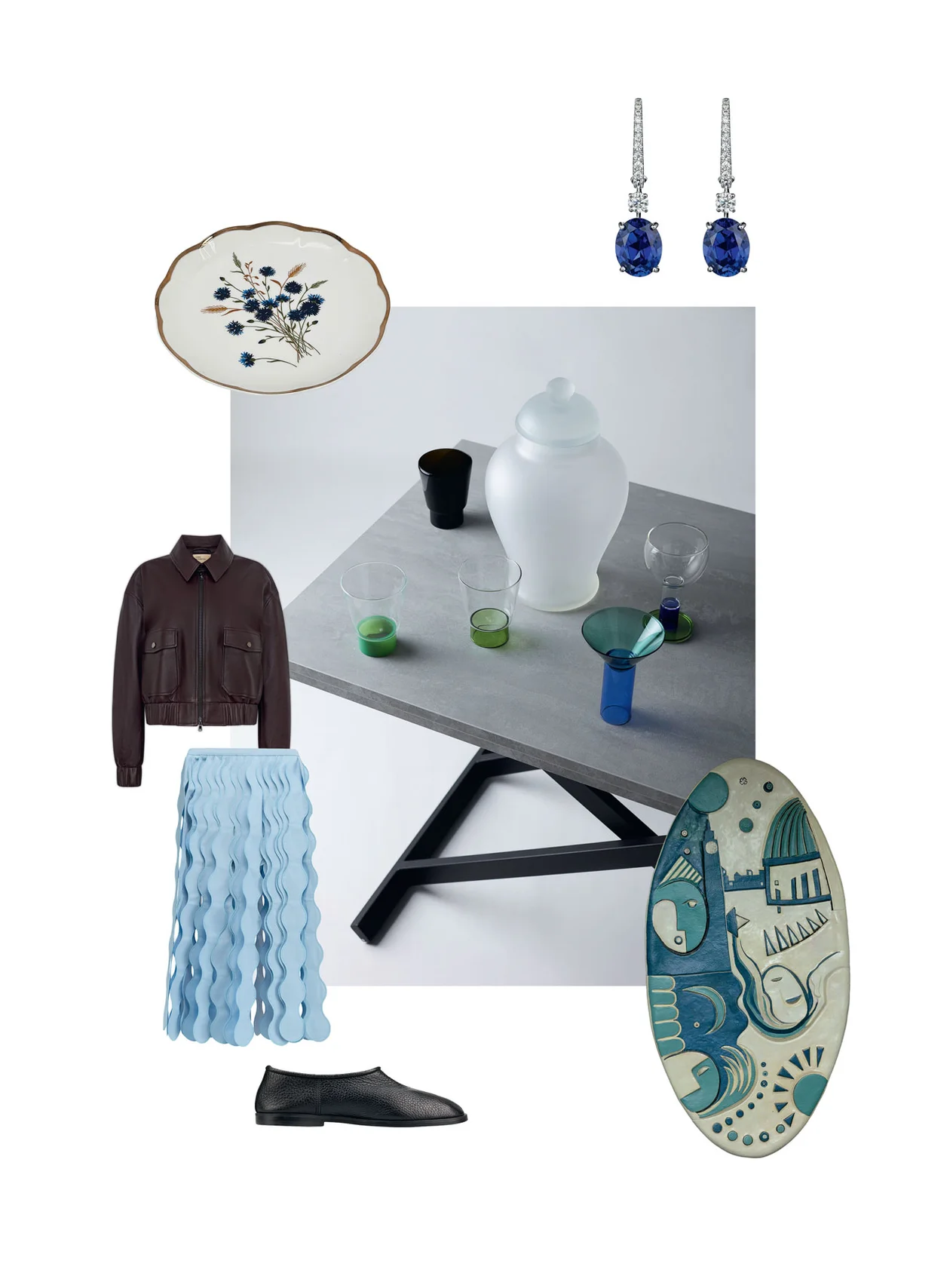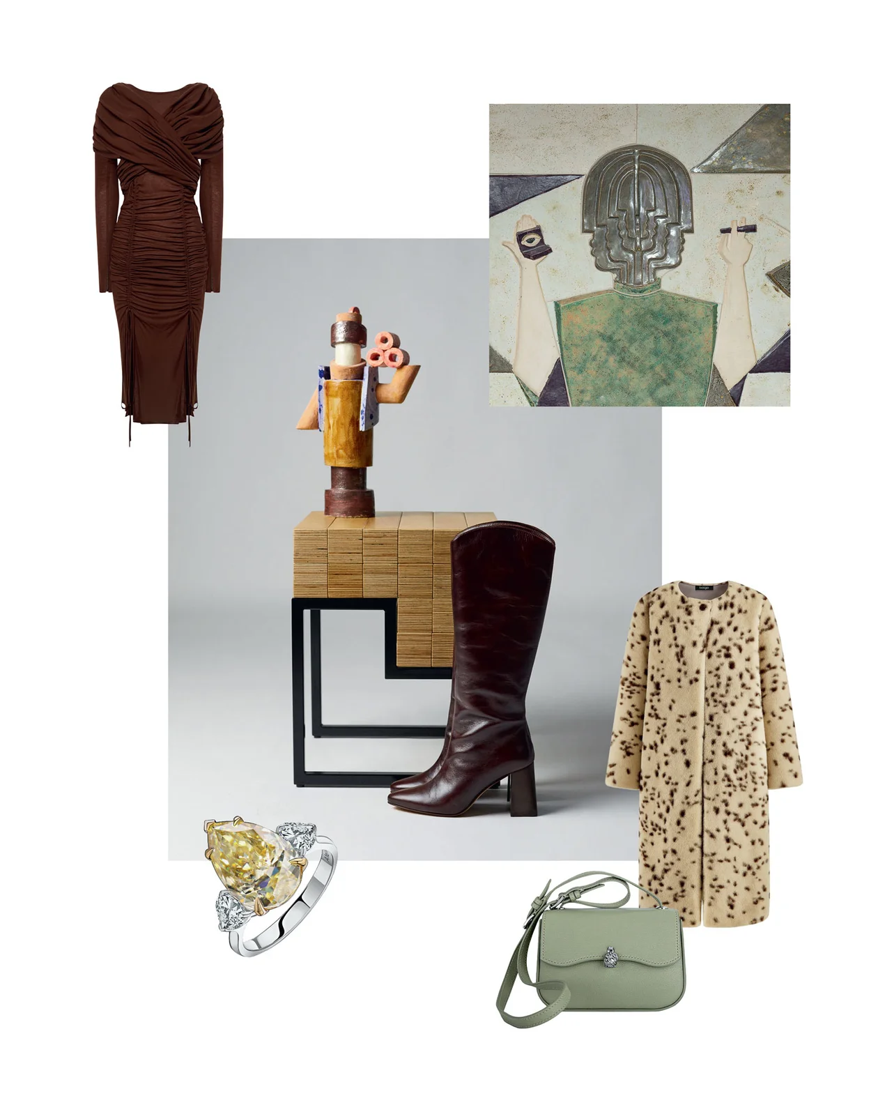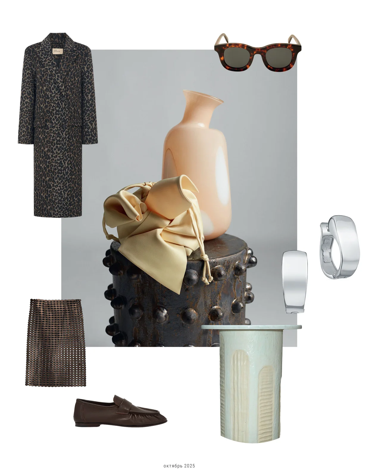 Керамический столик Iron, DirtyHands ceramic. На столике: стеклянная ваза, IVOLGA; атласная сумка Kyoto Buttermilk, Madame Chatelet