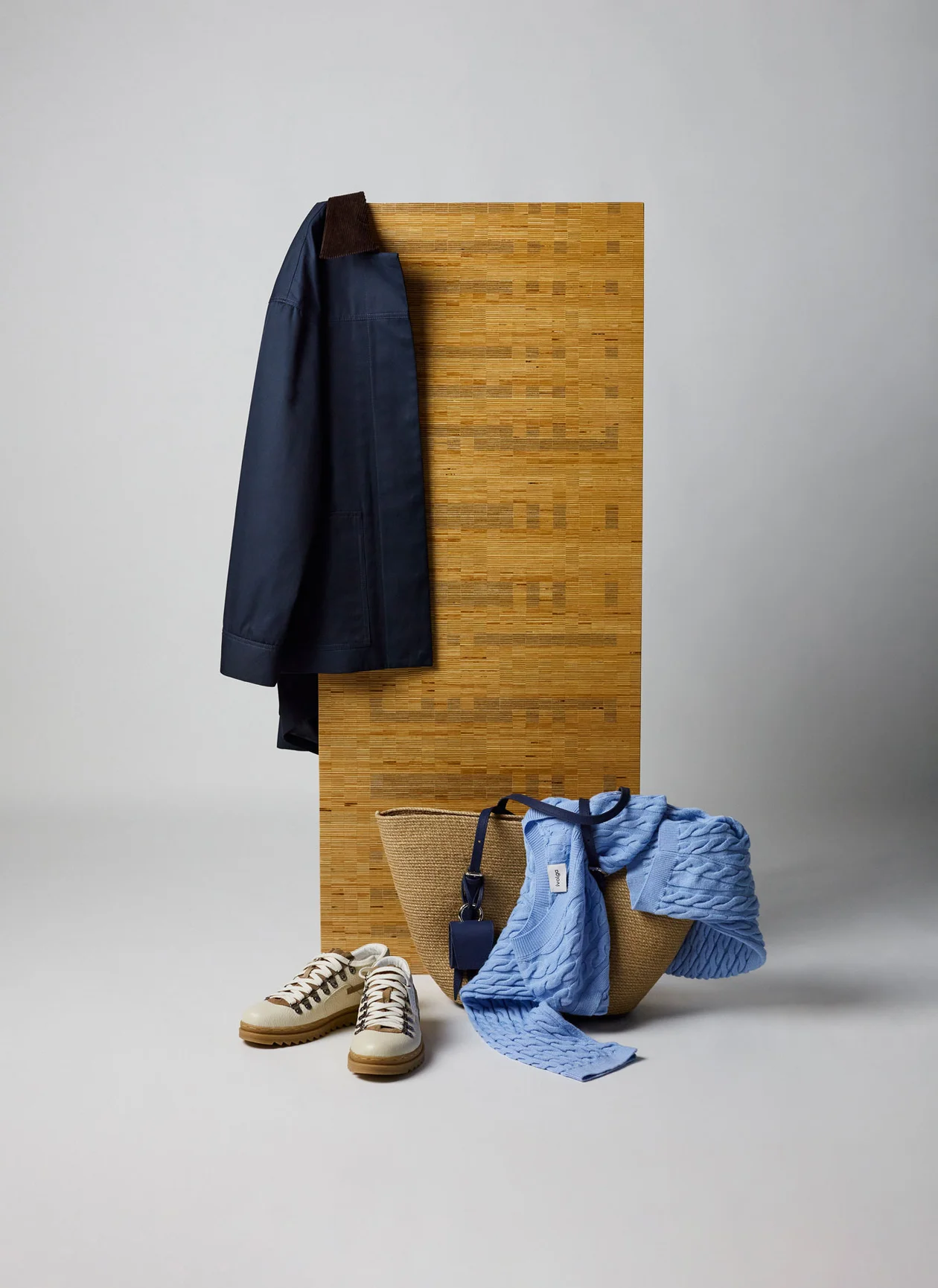 Панно с отделкой из фанерных кубиков, ARCHPOLE. Возле панно: хлопковая куртка, FASHION REBELS; сумка Jute из джута и кожи, PARS; джемпер из шерсти с акрилом, IVOLGA; кожаные хайкеры, HOVERS