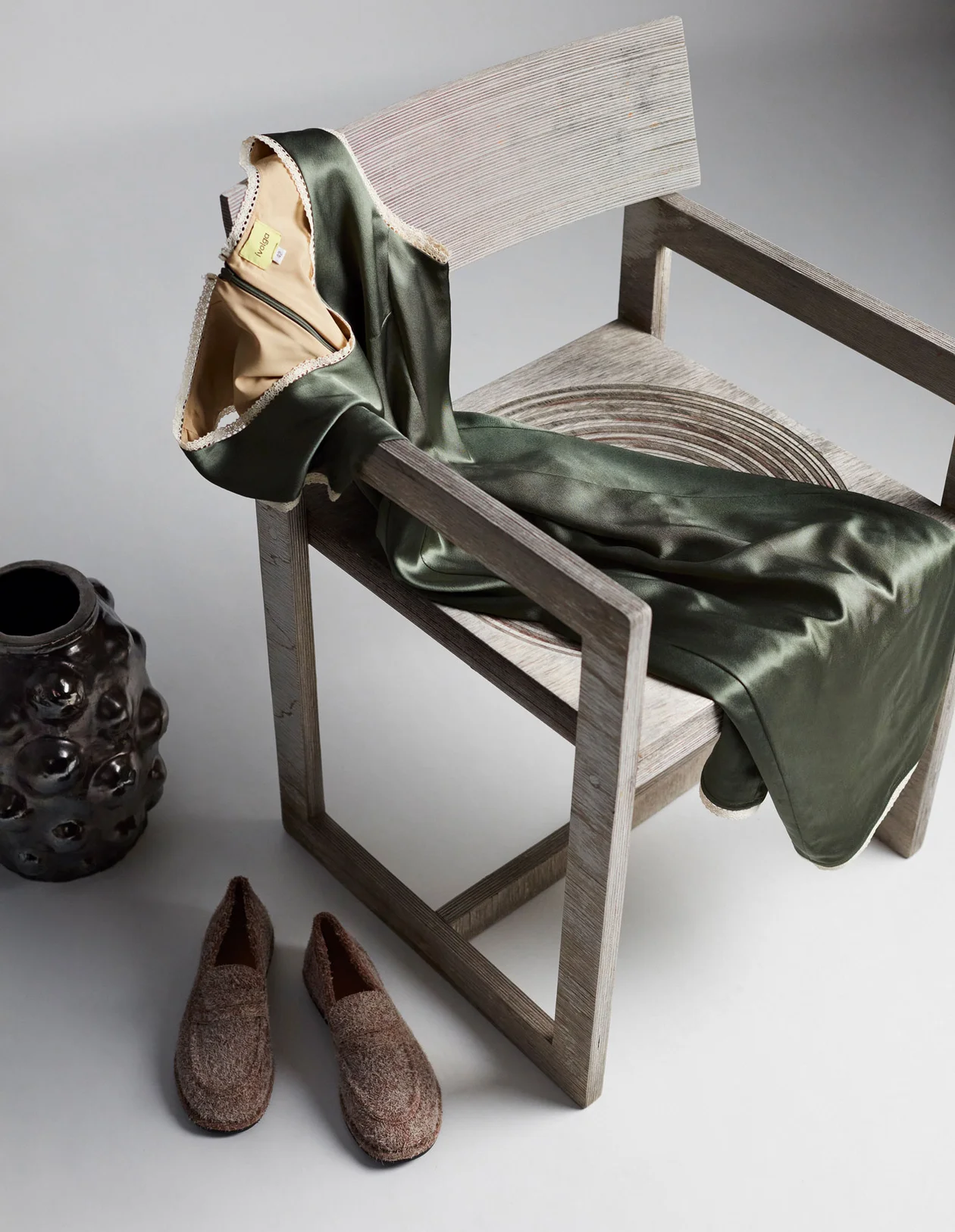 Полукресло «Бразильская луна», ARCHPOLE. На кресле и рядом с ним: платье из вискозы, IVOLGA; замшевые лоферы Lia Tobacco Fluffy, LUSAVOU; ваза, DIRTYHANDS CERAMIC