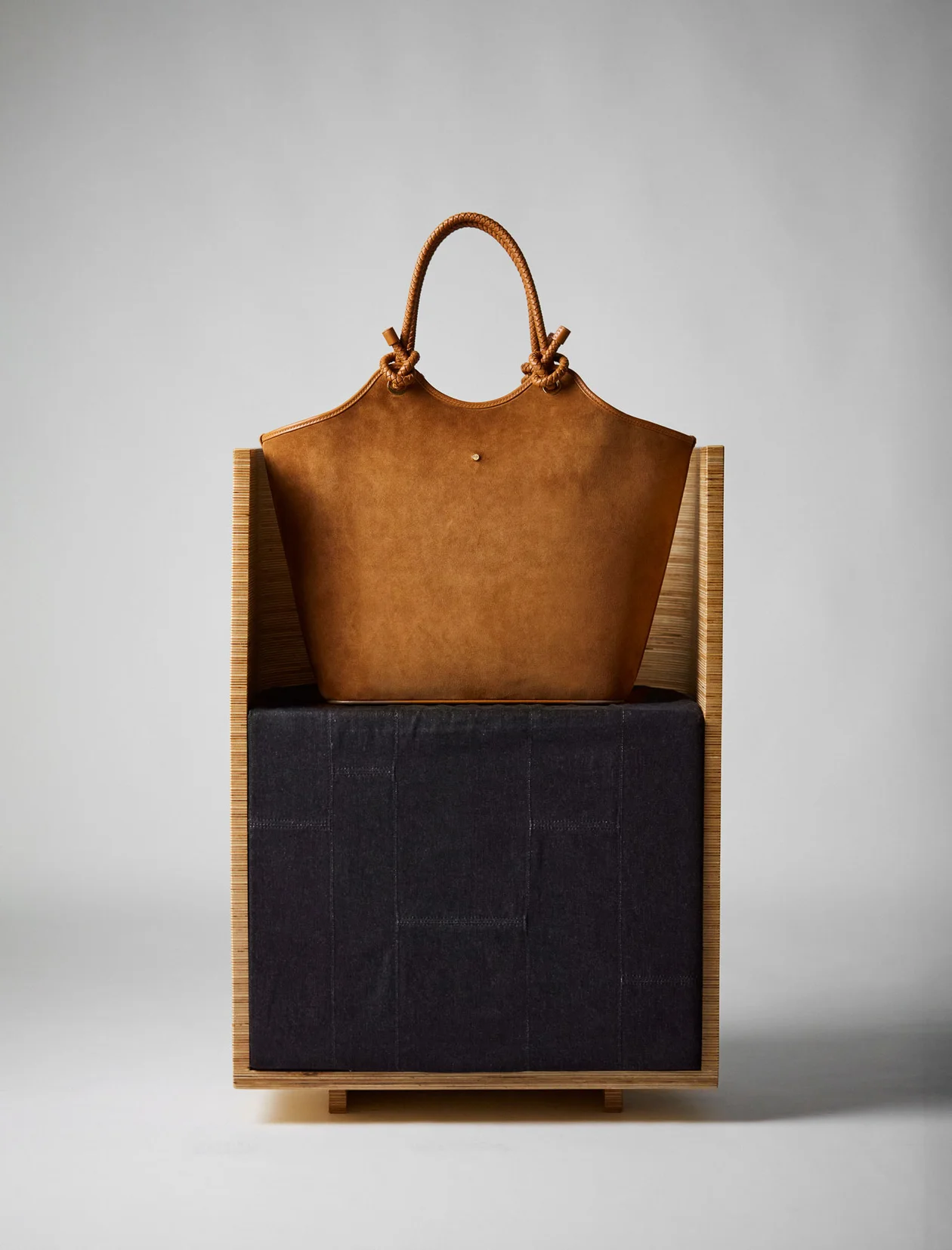 Кресло «Ваза» из березовой фанеры и бычьей кожи, ARCHPOLE. На кресле: замшевая сумка Porto, PARS