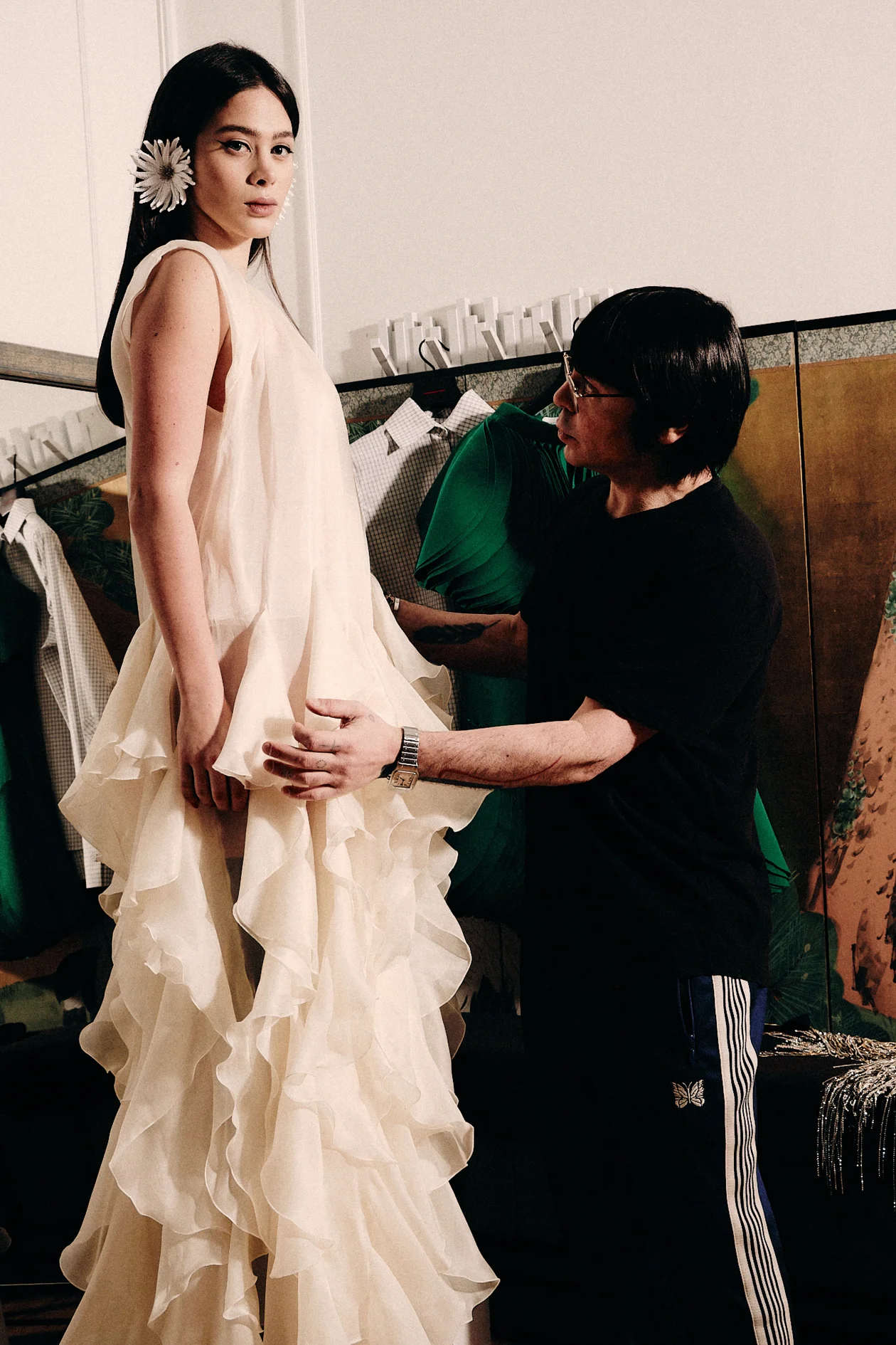 Появляются и другие прекрасные дамы, у которых есть свои мини-производства, мы с ними работаем, размещаем заказы. Когда готовы эскизы коллекции, мы их вызываем и распределяем между ними работу. Допустим, у нас около ста эскизов. И они выбирают, кто какую часть на себя берет. Потом они подготавливают примерку, приезжают к нам сюда, мы примеряемся — и уже запускаем в основной ткани.