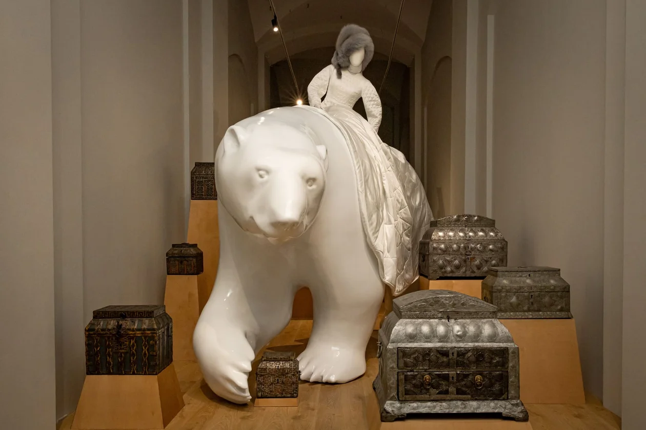 В Государственном историческом музее открывается выставка-инсталляция «Сны Алены». Алена Ахмадуллина лично встретила клуб МОСК еще накануне и устроила предпросмотр — и это очень красиво. Алена теперь выступает не только модельером, но и художником, а музей — ее соавтором. Специально для проекта была задействована часть постоянной коллекции: резные наличники, старинные орудия труда, кованые сундуки, расписные изразцы, кокошники и металлическая утварь. А все представленные модели платьев созданы эксклюзивно для выставки.