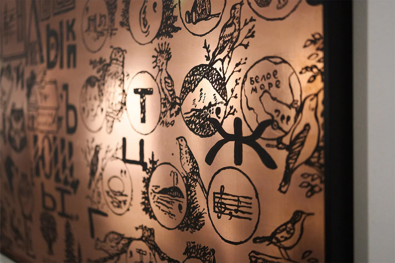 Экспозиция объединяет графику, живопись и инсталляцию — от работ о непростых отношениях с родным калмыцким языком и воспоминаниях о детстве конца девяностых – начала нулевых до размышлений о культе образования, больших переменах и привычке уезжать из родного дома в поисках лучшей жизни.