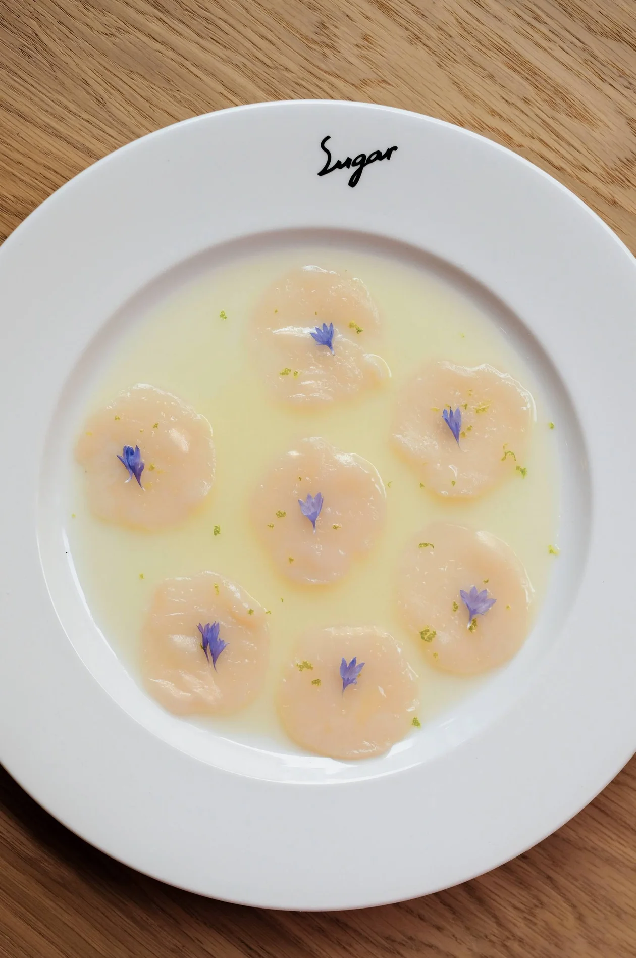 Крудо из сибаса, лимон, зеленое масло и круто из лосося, оливковое масло. грейпфрут
