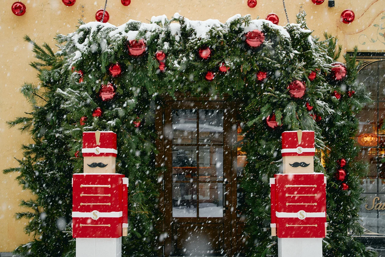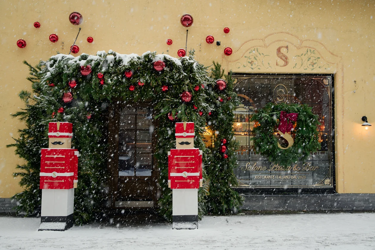 Salone pasta&bar на входе охраняют двухметровые Щелкунчики. Классический новогодний декор переиграли по-новому: шарами зашли на фасад, собрали рождественские венки с брендированной буквой S и добавили змею (символ 2025 года), которую видно с двух сторон здания.
