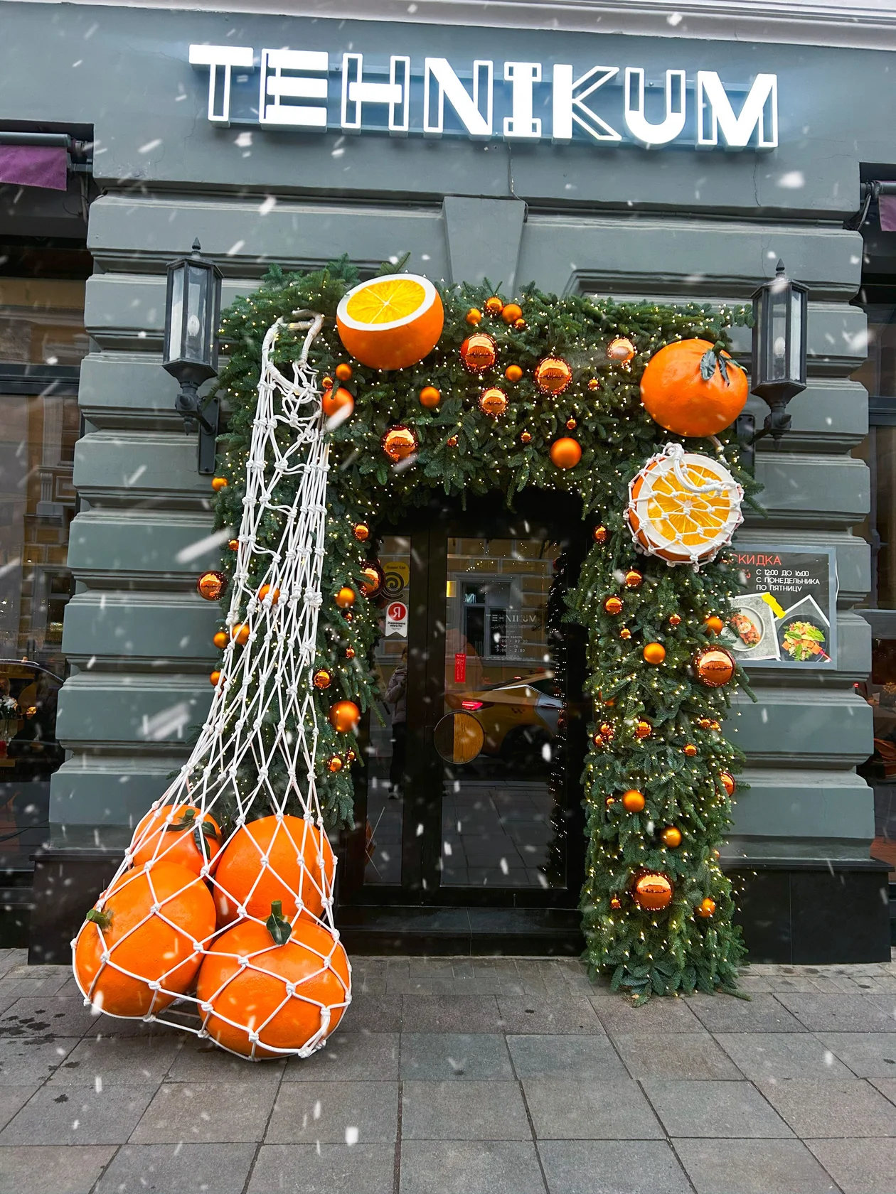 После ошеломительного успеха новогодних леденцов в прошлом году Tehnikum вновь обратился к Александру Спирову. Этой зимой их место заняли мандарины, созданные вручную (подготовка заняла около месяца!). С первого дня фасад WRF превратился в новогоднюю фотозону, очередь к которой не уменьшается даже вечером.