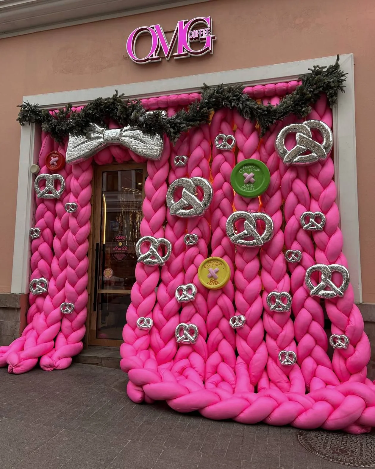 Визионеры из OMG Coffee создают тренды чаще, чем раз в сезон: летние ультра-розовые тубы с цветами к осени сменились светоотражающими мухоморами, тыквенной лавкой и паучьими сетями, а уже сейчас уступили место метровым косам, опутавшим серебристые кренделя (на Кузнецком Мосту) и огромным дутым бантам на хромированном фоне (на «Арме»).
