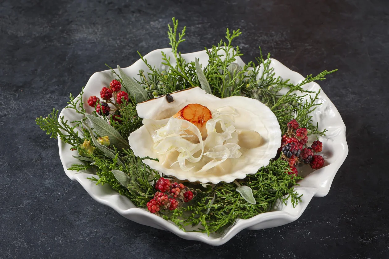 В меню тартар, японское окономияки, стриплойн «Россини» с фуа-гра и трюфельным консоме, а на десерт — корзинка из слоеного теста со сметанным кремом, карамелью и сливочным грибным мороженым.