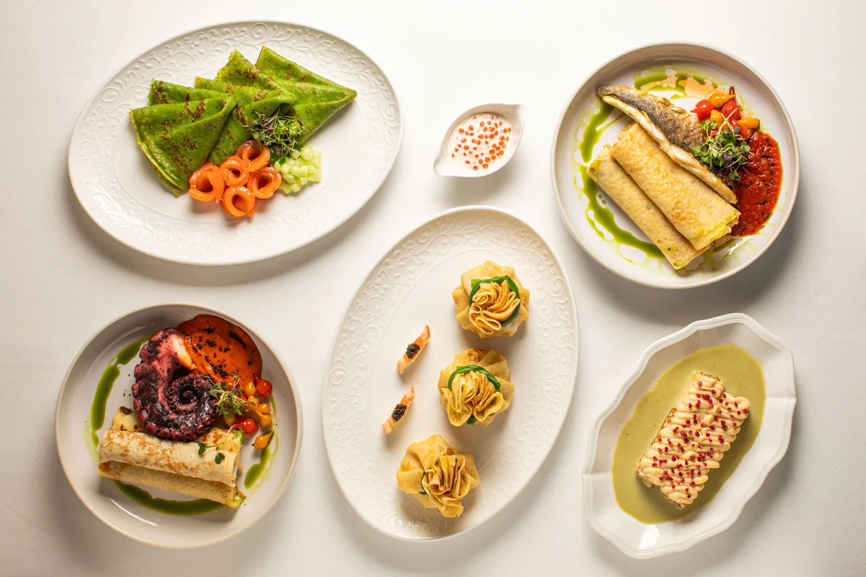 Главный хит — блины в золоте 23 карата с крабом и тремя видами икры в сливочно-винном соусе. В разделе со сладким особенно удались новые версии «Креп-Сюзетт», блины с фисташковым кремом и ягодами, «Рафаэлло», нутелла с хрустящим миндалем и блинный торт со смородиновым кремом и мороженым из лаванды.