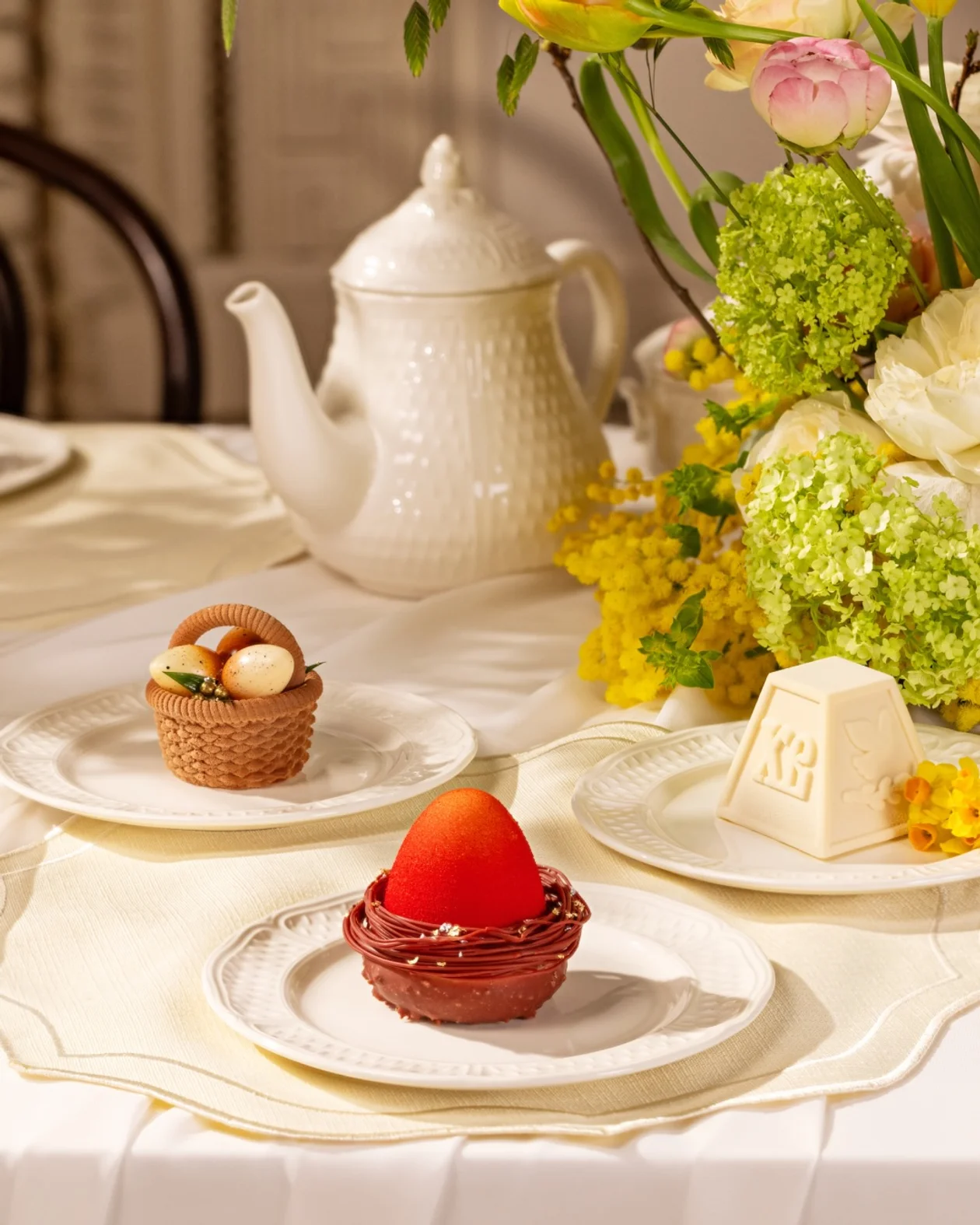 Не куличами едиными. В «Кофемании» доминантой пасхальной коллекции стали десерты. Среди них — пирожное «Пасхальная корзина» с ореховым бисквитом, «Красное-прекрасное» — оммаж шоколадным яйцам, но на основе бисквита с малиновым муссом и конфитюром апельсин–лимон, а также творожная пасха на рикотте с нугой и апельсиновым кремом.