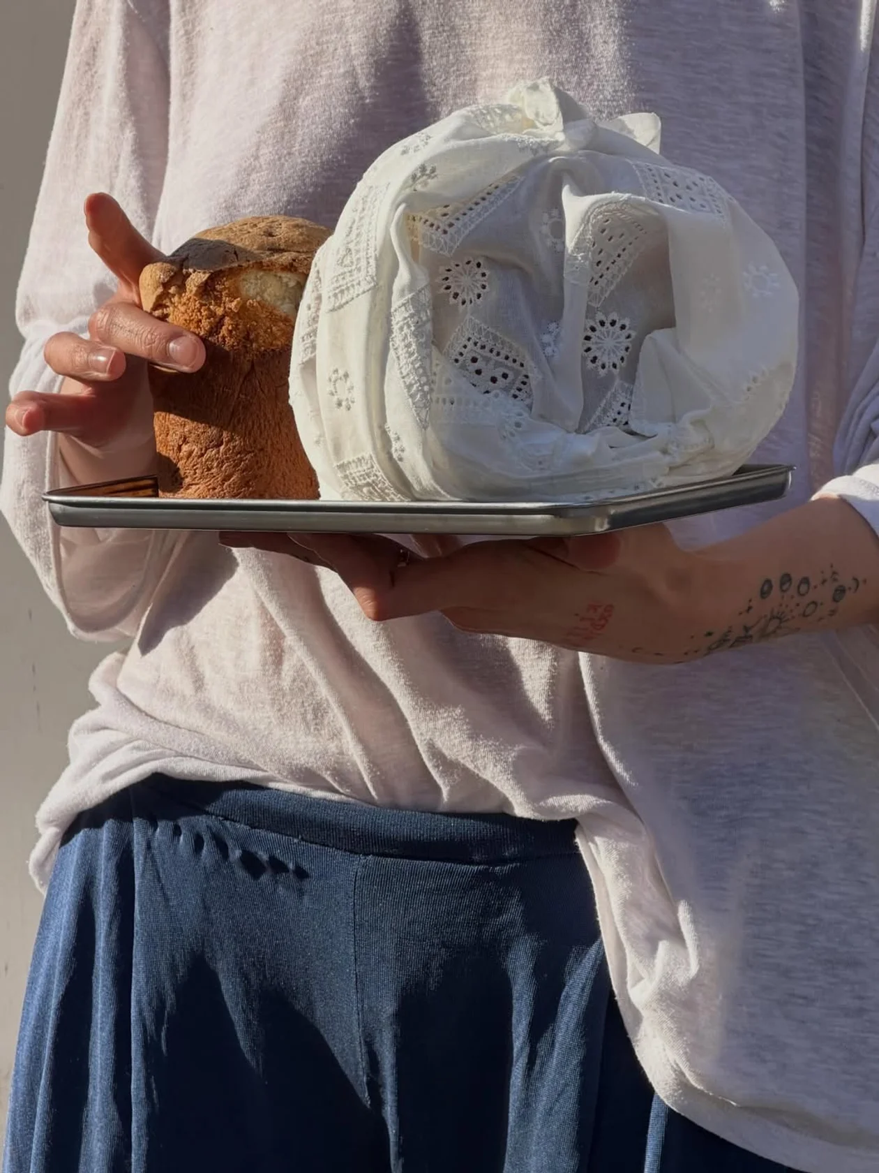 В Zoe — два пути: шоколад–апельсин с ванильным ганашем или фисташка–лимон с фисташковым ганашем на закваске левито мадре для пущей воздушности (так что процесс приготовления занимает несколько дней). Какой бы вы ни выбрали, каждый завернут в текстильную салфетку, которую потом можно легко интегрировать в сет-дизайн.