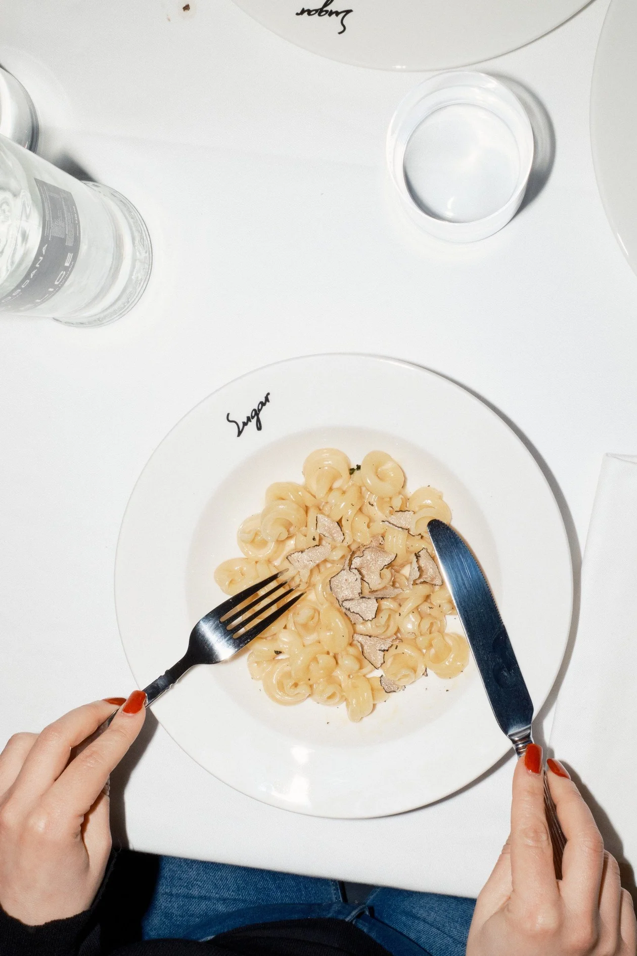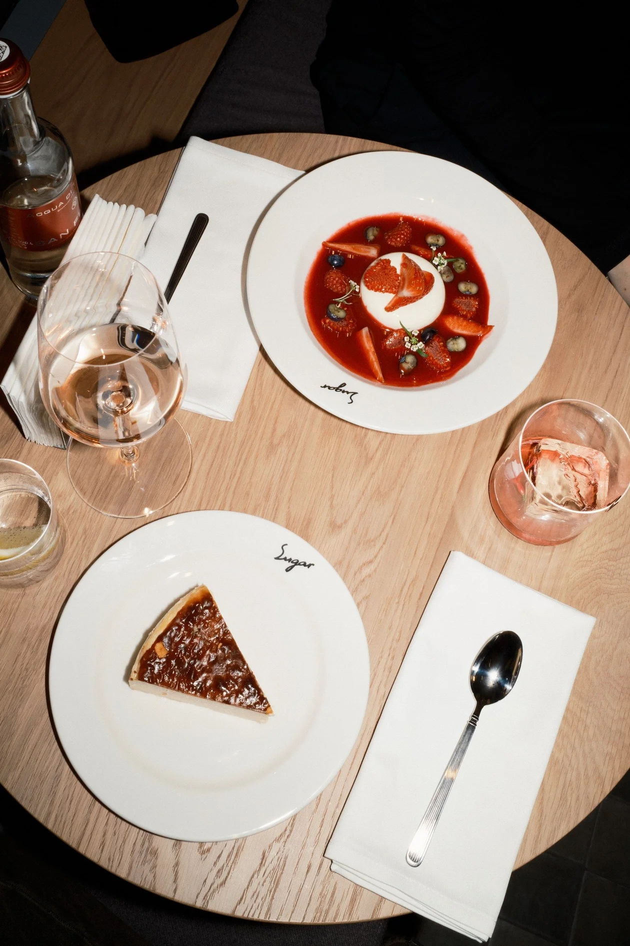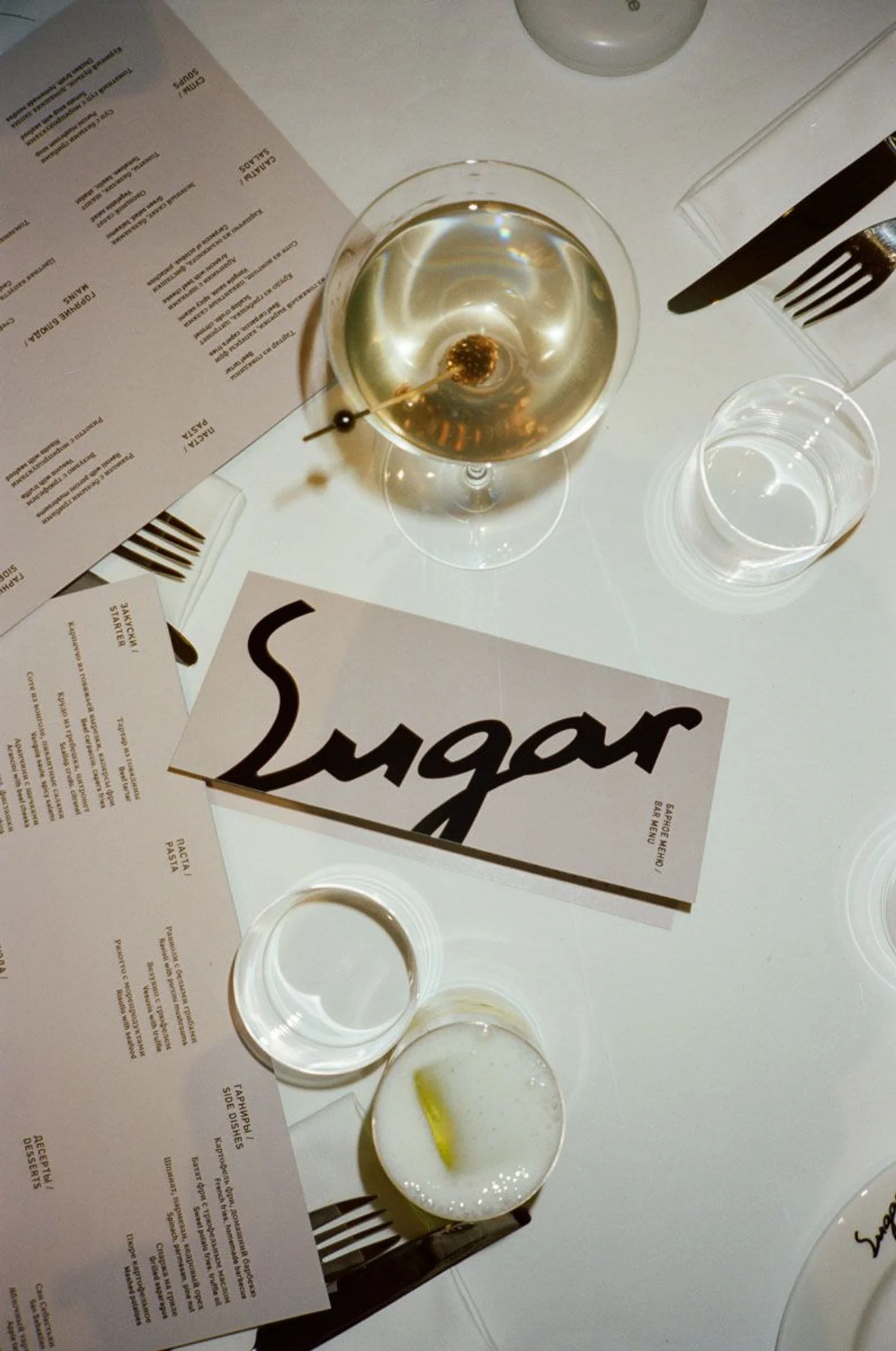 Меню — под стать интерьеру: легкое, понятное и без перегруза. В общем, Артем сделал ставку на комфорт-фуд с акцентом на мясо — всё, как предпочитает он сам. Правда, на пре-опенинге мы заметили, что вместо стейков в тарелках чаще всего мелькали крудо из гребешка с соусом цитронет, тартар из говядины, фирменный бургер Sugar, сибас аква-пацца и, конечно же, паста с трюфелем. Десерты, как и лишние калории, Москва не особо жалует, поэтому предлагают всего три варианта: чизкейк Сан-Себастьян с бархатной сердцевиной, панна-котту в окружении свежих ягод и тарт татен.