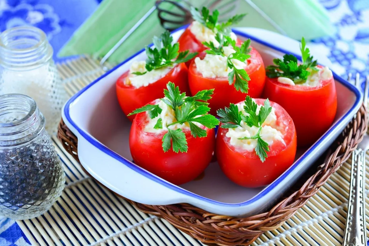 Сегодня рецептом с нами поделилась PR-директор «Москвички» Екатерина Чаковская. Она любит его за простоту и скорость: на приготовление фаршированных помидоров уходит всего десять минут.