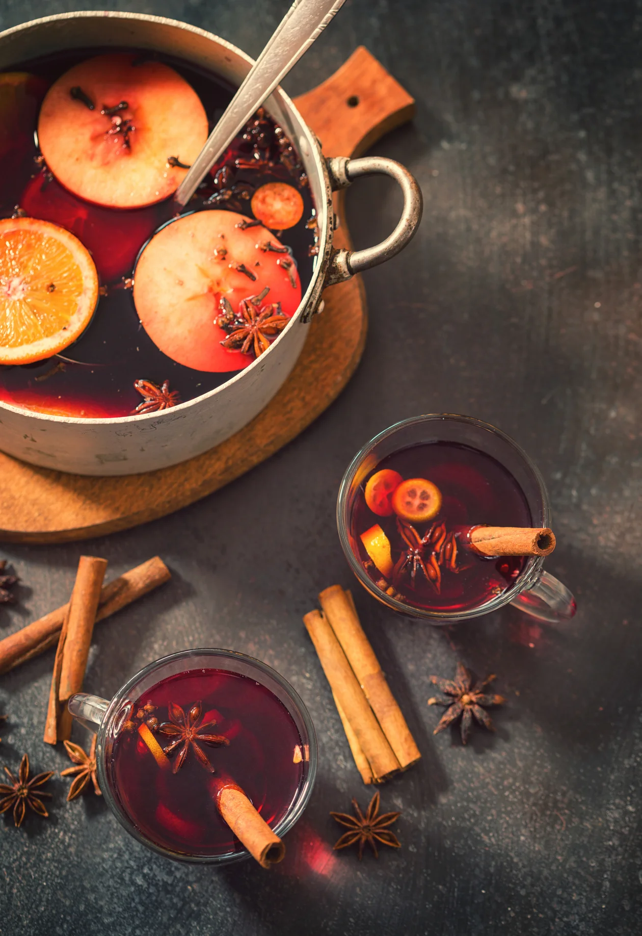 Доведите сок до кипения, добавьте нарезанные фрукты и специи. Проварите 5–10 минут, затем дайте настояться под крышкой не менее часа — это ключ к насыщенному аромату. Подавайте горячим.
