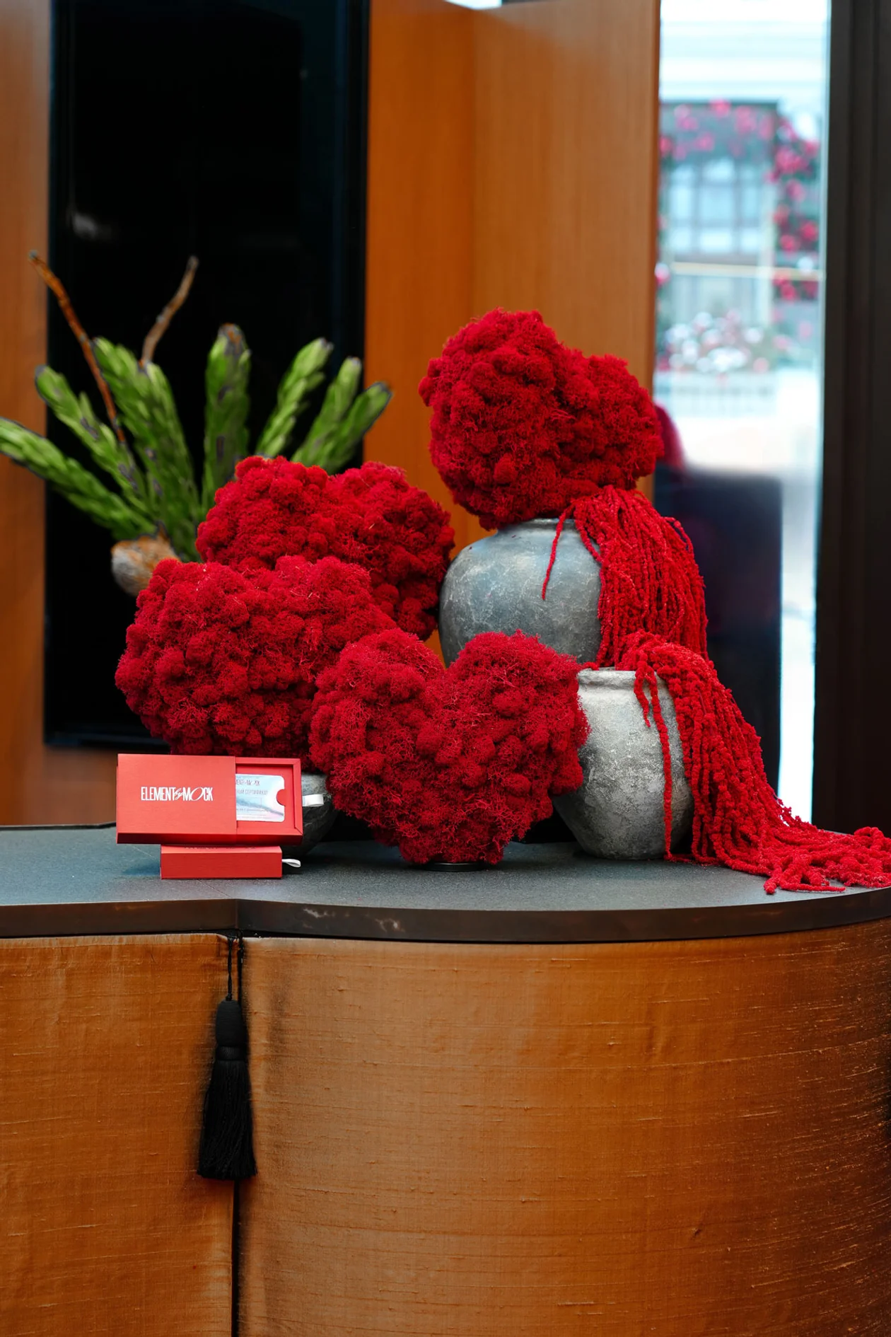 К празднику команда Element также представила лимитированную капсулу композиций в красных и розовых оттенках. В коллекции — как выверенная классика, так и более скульптурные формы с характером, например, сердца и медведь из красного мха, балансирующие на грани флористики и объектного дизайна.