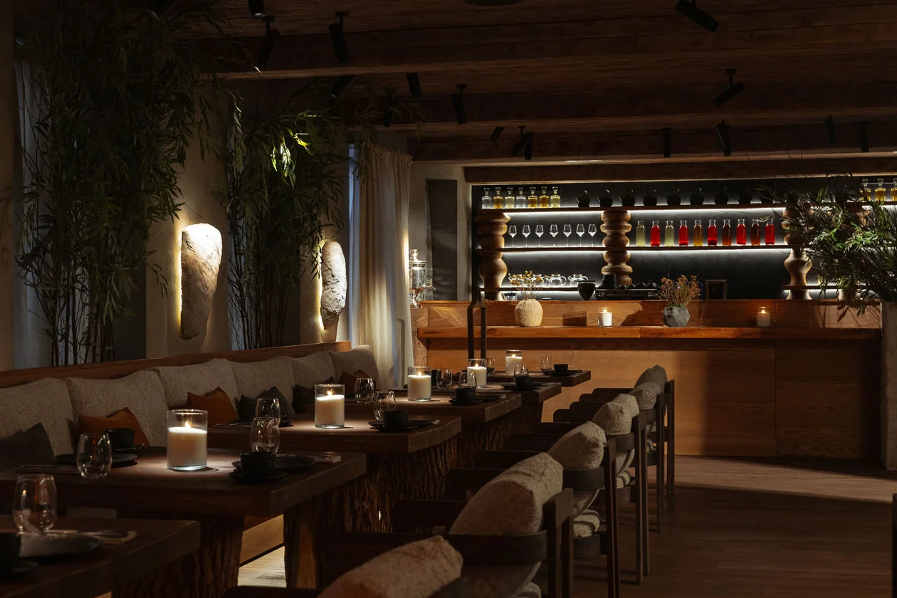 Интерьер органично вписывается в общую концепцию: здесь много натурального камня и дерева, камин, сухоцветы и живые растения. Так что получается полное погружение в северную природу.